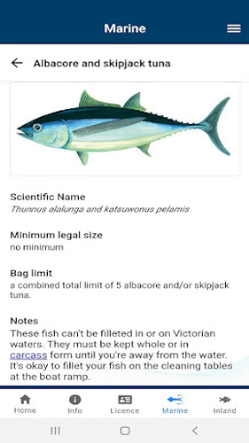 It describes size and bag limits, closed seasons and equipment restrictions. Other features include a direct link to purchase your fishing licence online, a licence outlet locator, connection to the 13FISH illegal fishing reporting line and a marine park/sanctuary boundary locator. This function uses the devices internal GPS to help fishers determine whether they are in or approaching a marine park or sanctuary.