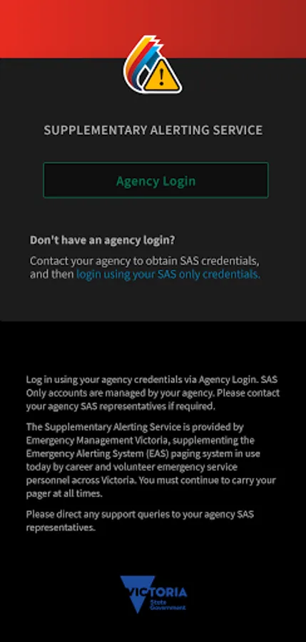 The Supplementary Alerting Service app is an official Victorian Government app for career and volunteer emergency services personnel. It supplements and connects to the Emergency Alerting System in use today by career and volunteer emergency service personnel across Victoria.