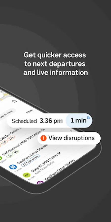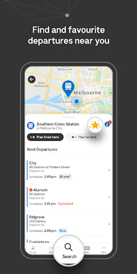 - Search: Look for destinations, stops, routes and myki outlets, or use your current location to search for nearby transport options.
