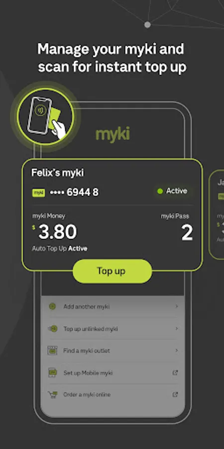 - myki top up: Hold your myki to the back of your phone to check your balance and top up instantly