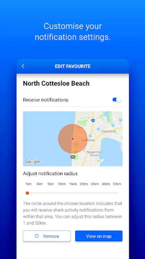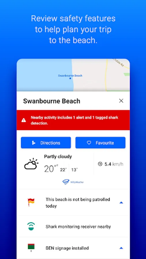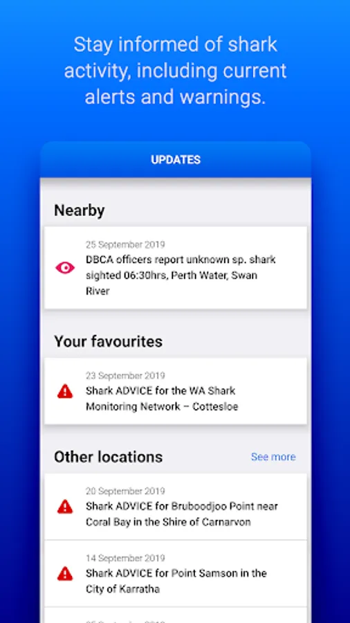 Stay informed of shark activity, including current alerts and warnings. Information is prioritised into ‘Nearby’, ‘Your Favourites’ and ‘Other Locations’, giving you the most relevant information first.
