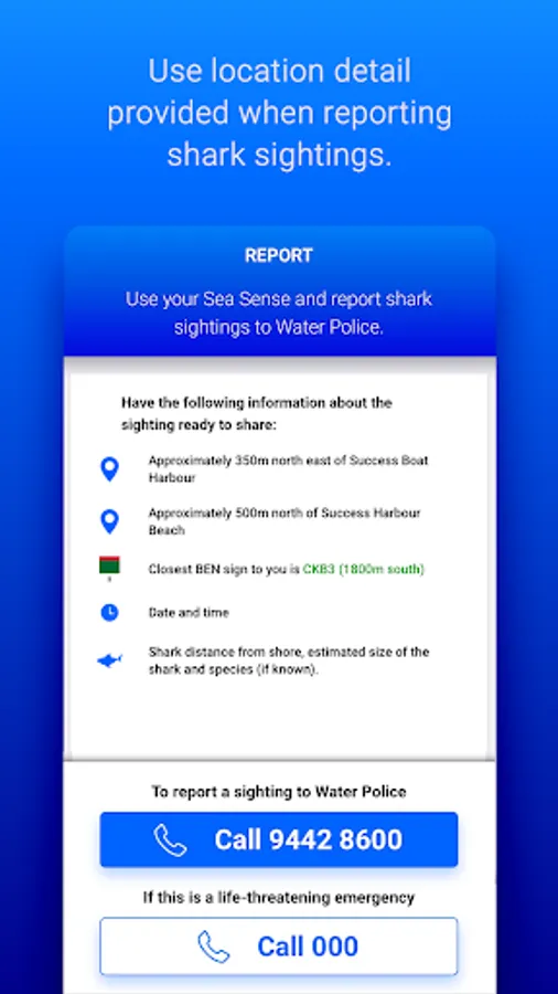 Using location services, the app can provide you with information about your current coastal location. Use the details provided and the quick call link to report shark sightings or whale carcasses (which are known to attract sharks) to Water Police as soon as possible.