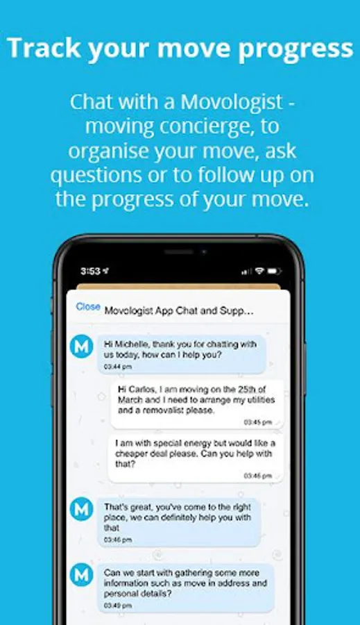 You can chat with a Movologist anytime by using the Chat Support feature. Ask questions and arrange your move via chat.