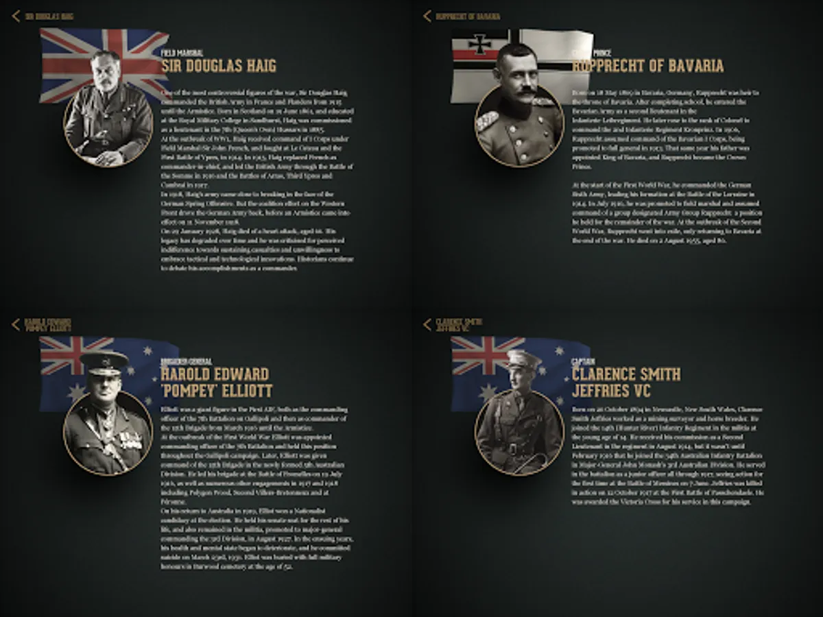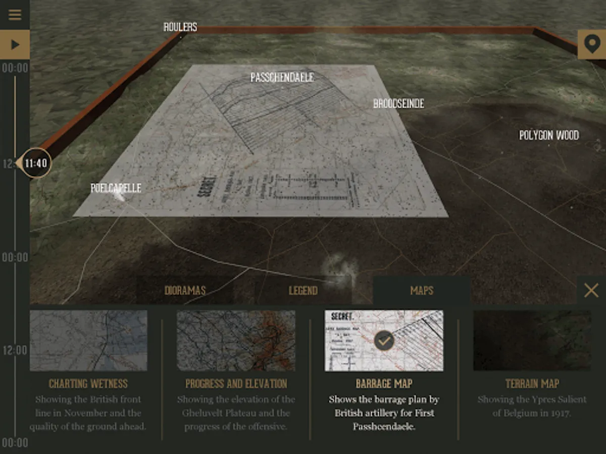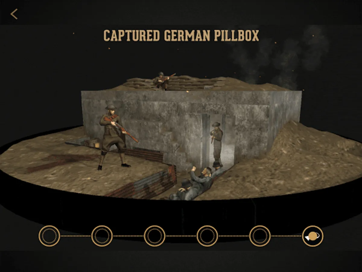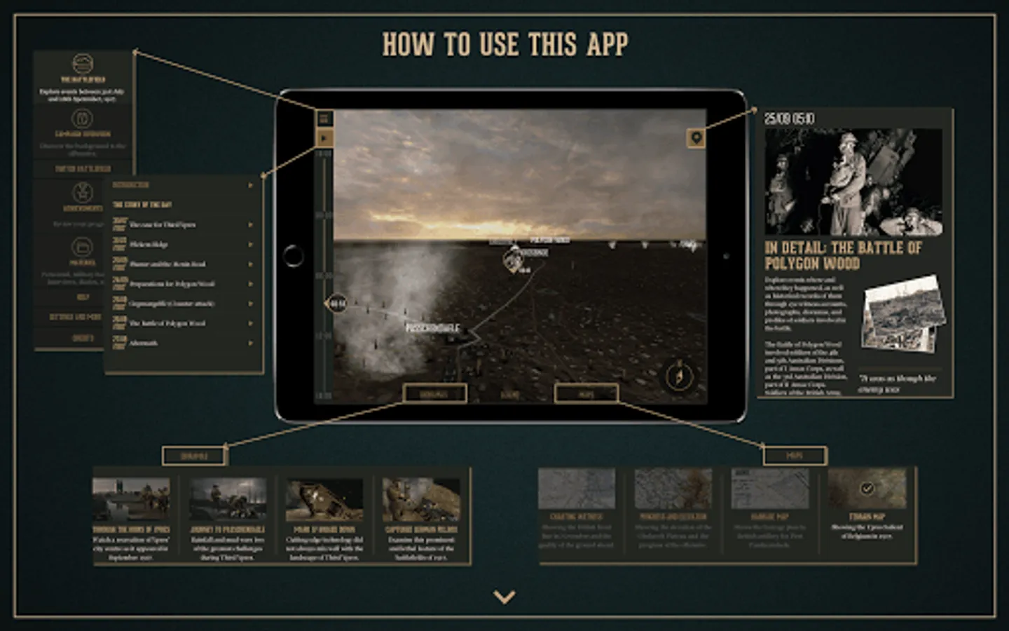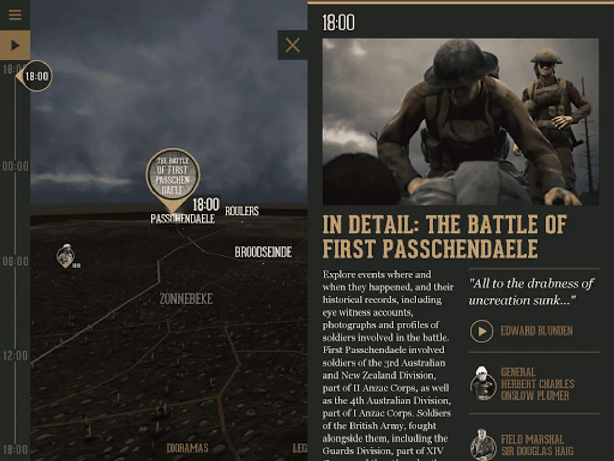 • Accurate, interactive 3D map space of the Ypres Salient, pinpointing events across both battles and providing context.