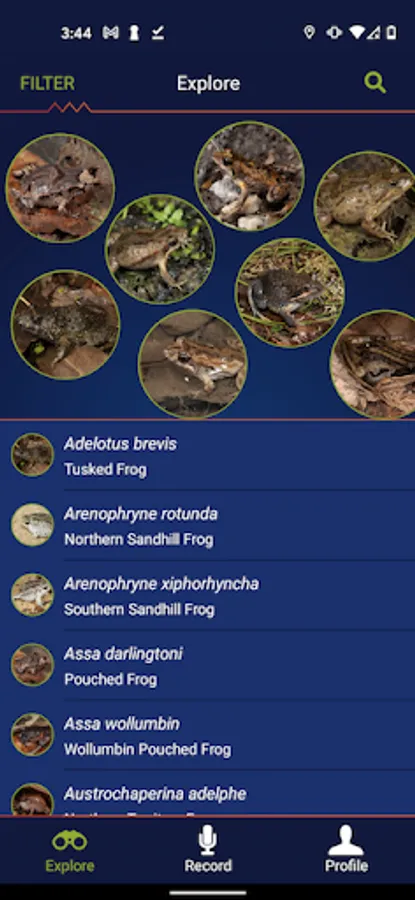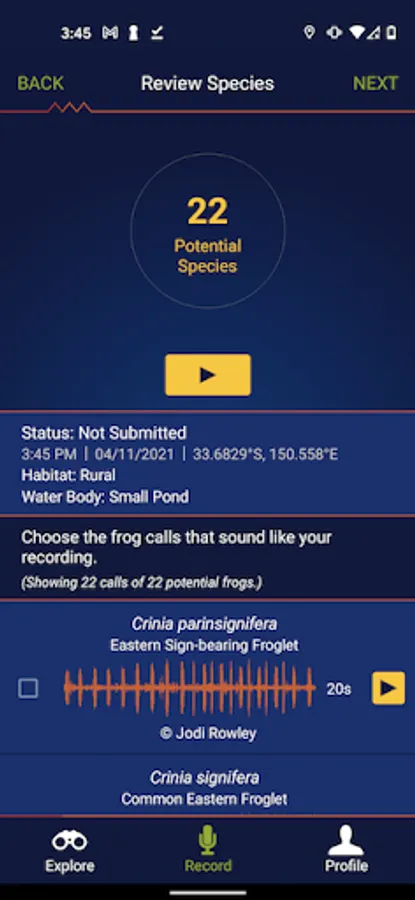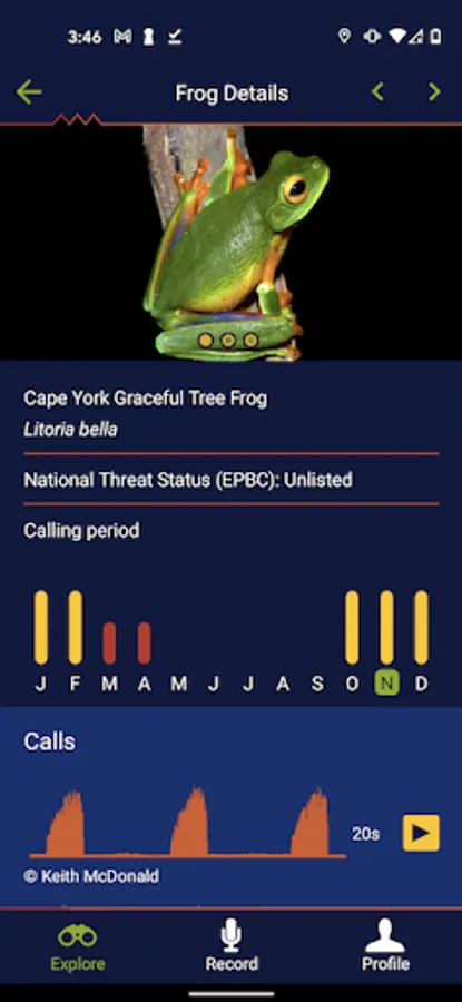 Use the App to create a free profile and record frog calls. You can choose to match your calls to the frog calls on the app, then submit your recordings to the Australian Museum frog experts to listen and verify the species.