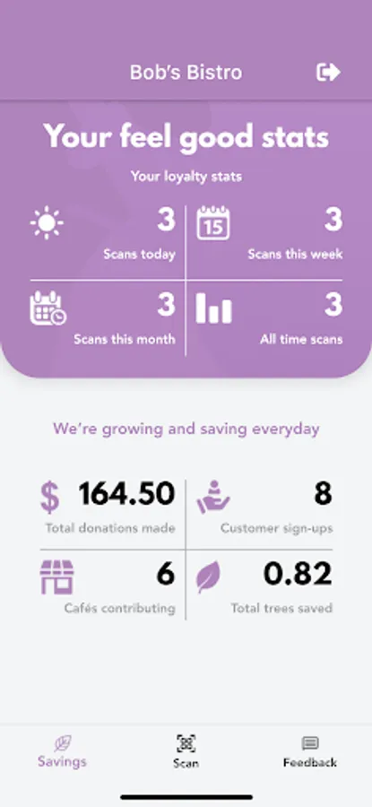 Download the purple icon ‘Café’ version of the CUPforLIFE app to your mobile device. Answer some basic business questions so we can ensure you are who you say you are, and so we can protect those details. When you submit the form we will accept you as a café onto the system and activate your account. You are then set to give out unique QR Codes to customers (that we will supply to you for free as stickers that are dishwasher and microwave safe). The customer then scans their unique QR code on to their phone to activate their account. They also stick the physical QR Code onto their cup, so you and others can see instantly that they are part of the CUPforLIFE community. This system allows you to connect with your customers at a level that will allow you to seek feedback on what your customers want, allowing you to make astute business decisions and grow. You can see via the statistics on your account how many people are part of the system and how many trees we have saved in the process with the direct link between your customers having a drink using CUPforLIFE, and reducing preventable waste while protecting our precious but declining ecosystems.