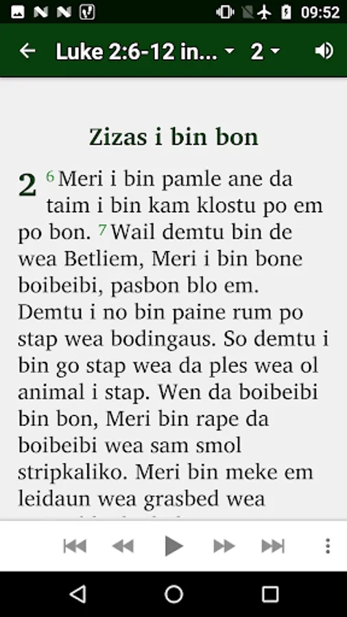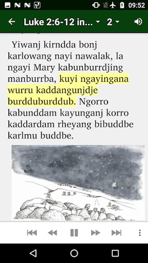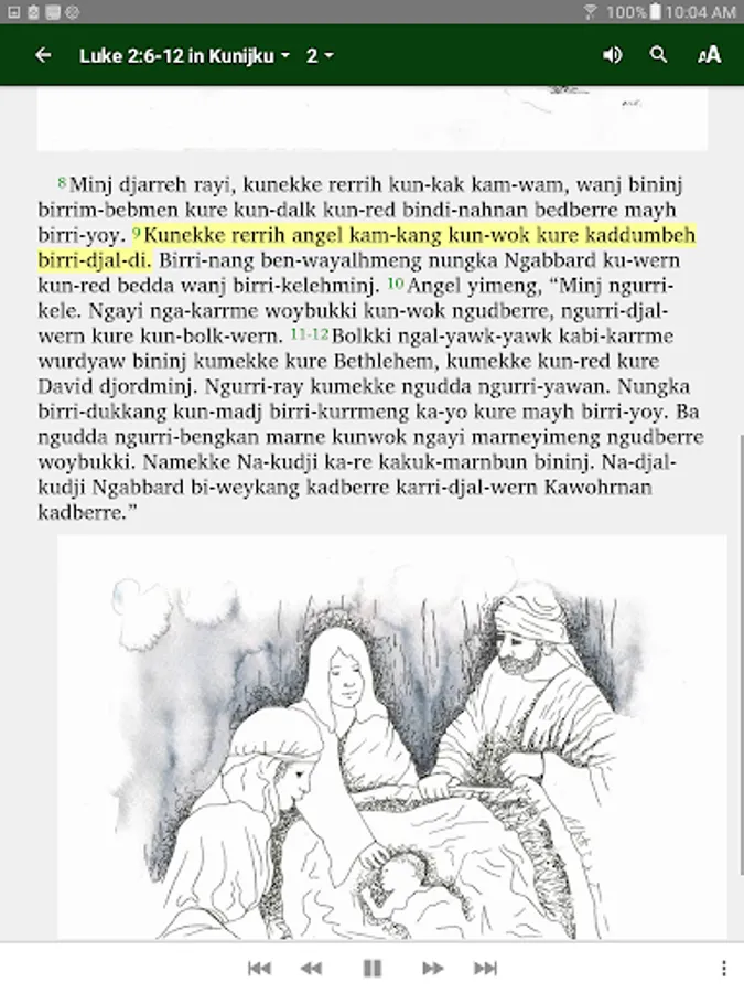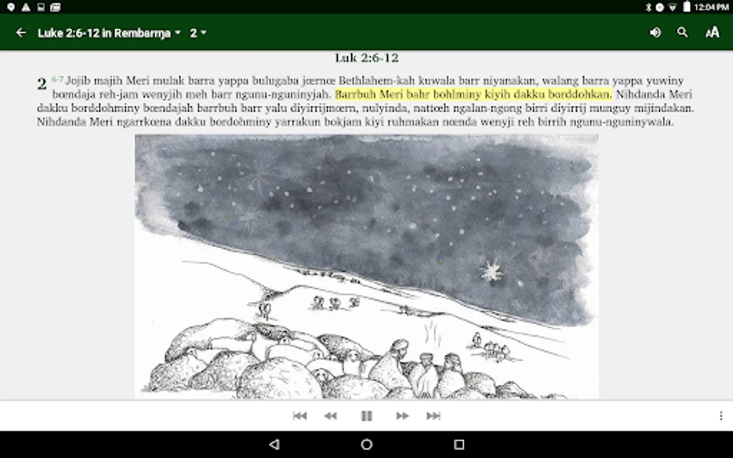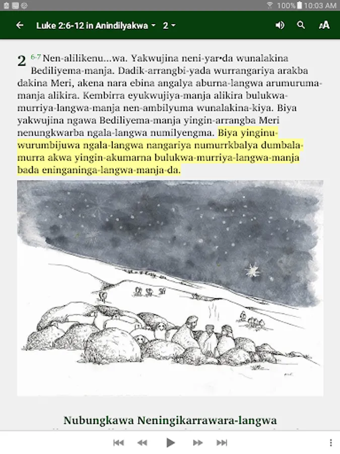 The Christmas Story from the Gospel of Luke chapter 2 verse 6-12 in twelve Australian languages including Adnyamathanha, Anindilyakwa, Gurindji, Kunbarlang, Kuninjku, Mawng, Ndjébbana, Nyoongar, Rembarŋa, Wangurri, Yumplatok (Torres Strait Creole) and Aboriginal English. Audio is available for some languages.