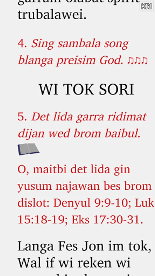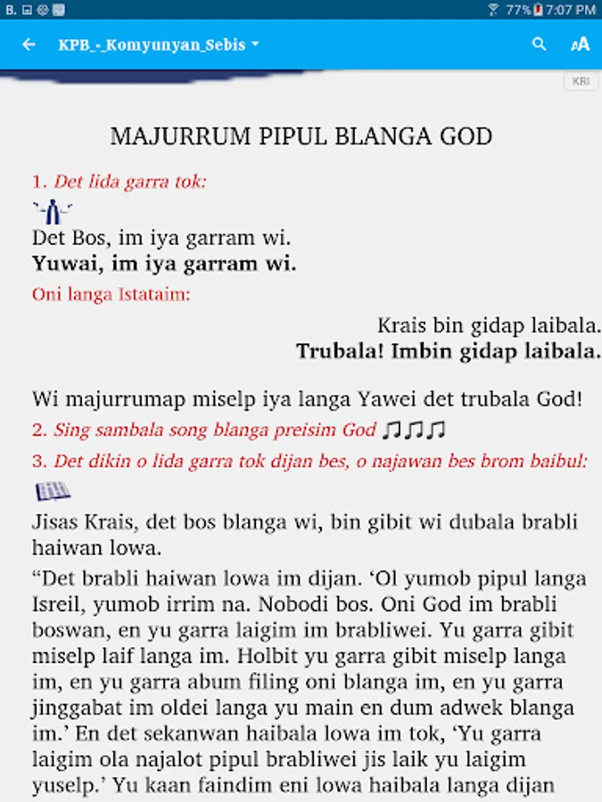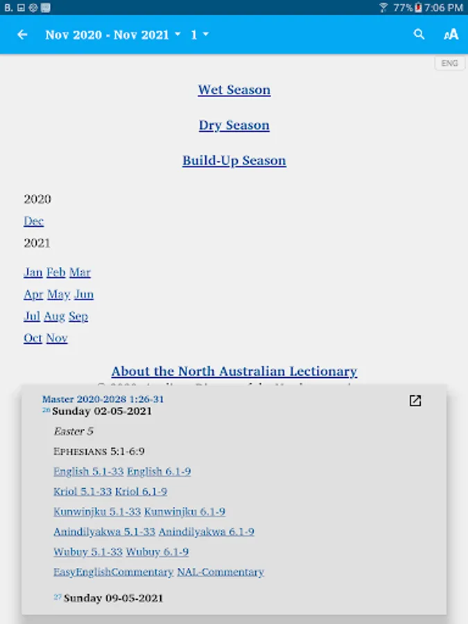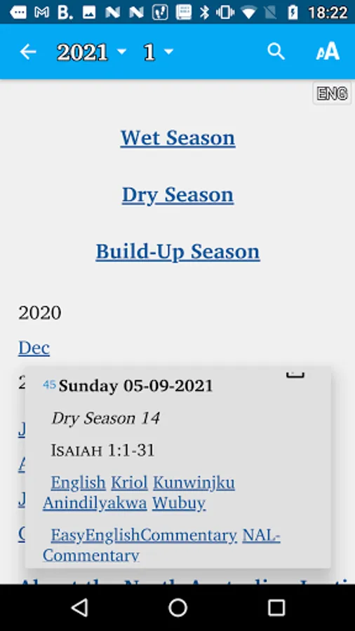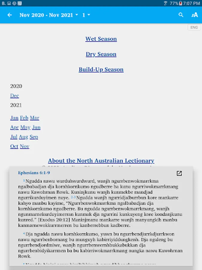 1. Find the bible reading for Sunday (in English, Kriol, Anindilyakwa, Kunwinjku and Wubuy where available)