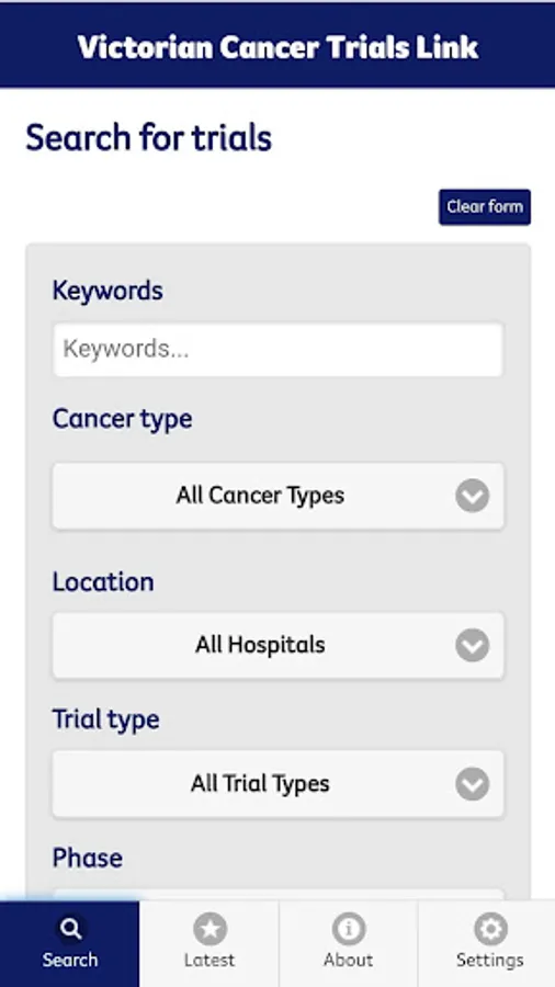 Users are able to search by one or more combinations of keyword, trial phase, tumour stream, tumour type, hospital and Cancer Trials Australia to find open treatment trials across Victoria.