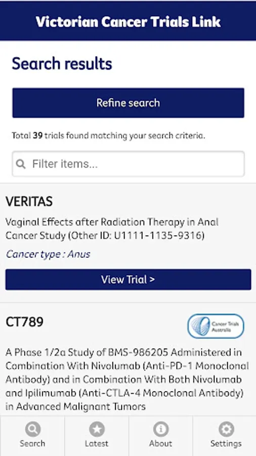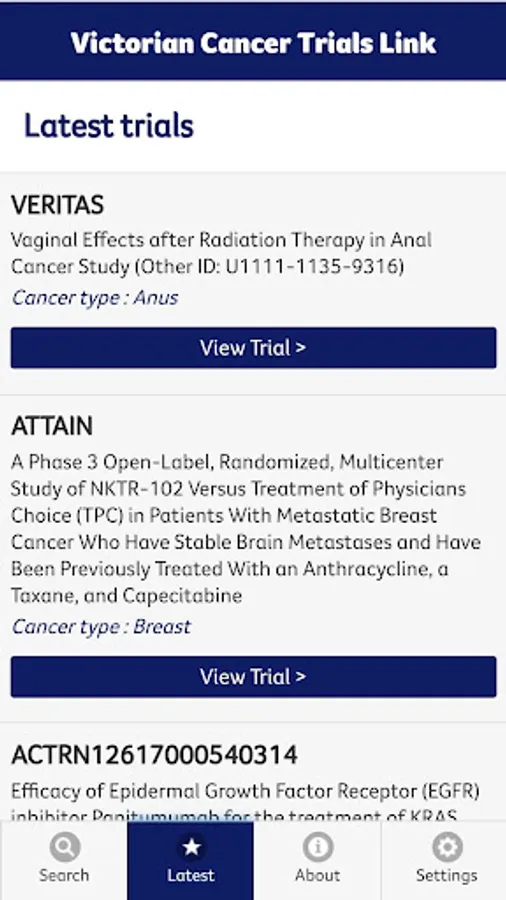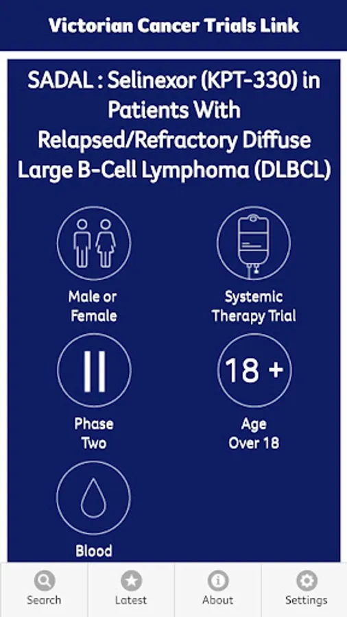 Where available each trial has direct web-links to registry websites to access in-depth eligibility criteria and sponsor information and contact details. The app also features a latest trials tab and customisable push notifications, to be alerted to any new trials in your tumour stream/s of practice.