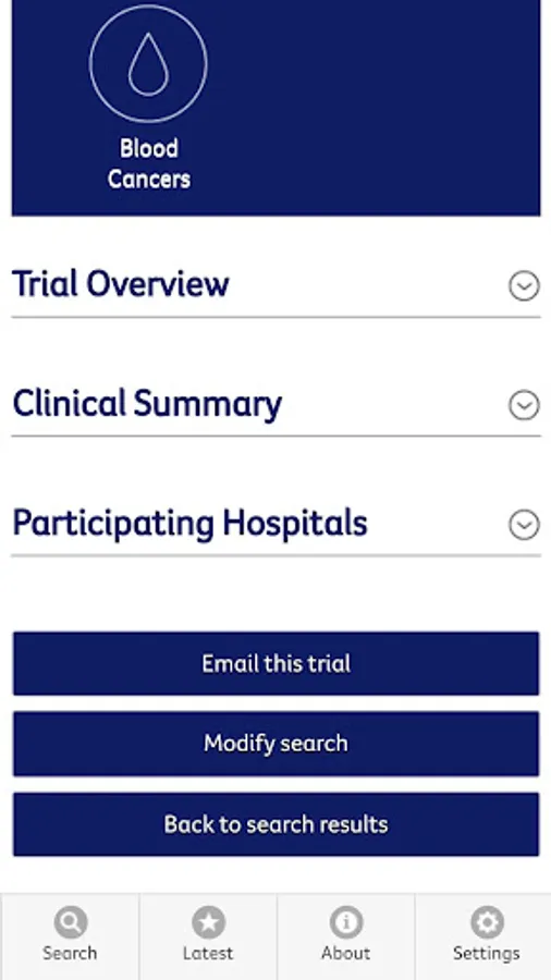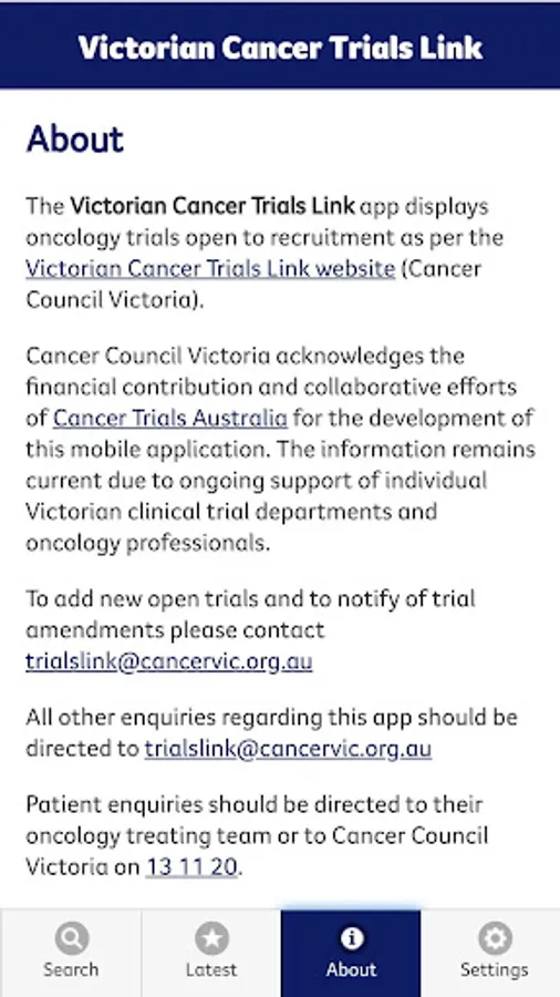 Each trial record, lists summary information about the trial in addition to a list of open recruiting sites in Victoria, with phone and email details of the site nominated contact person. There is a quick email link to alert the app’s manager of any incorrectly listed information.
