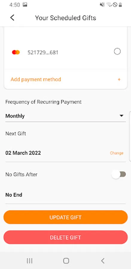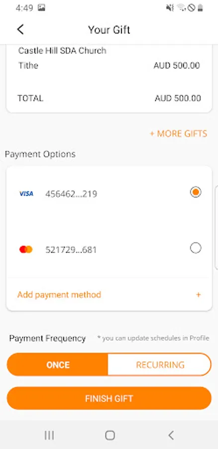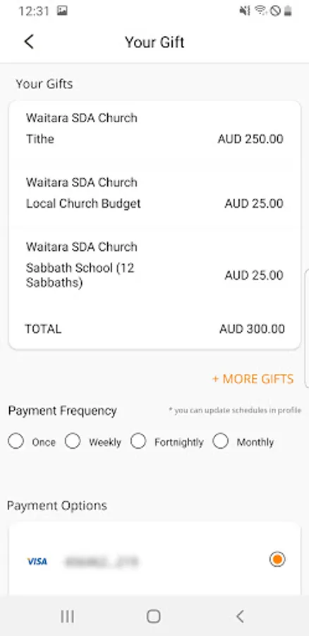 For those who wish to schedule planned giving, the app allows recurring transactions on a weekly, fortnightly, monthly or quarterly basis. Recurring transactions can be edited and deleted within the app. You can edit/delete recurring transactions by tapping on the respective recurring schedule on the Profile screen.