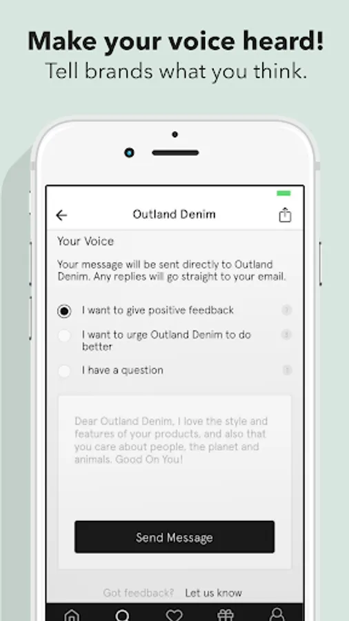 If the brand you're looking for isn't listed yet, just hit a button and we'll rate it! And if your favourite brand doesn’t make the grade, use Good On You to find sustainable alternatives that meet your needs. You can also use your consumer power by sending a message to brands, urging them to do better.