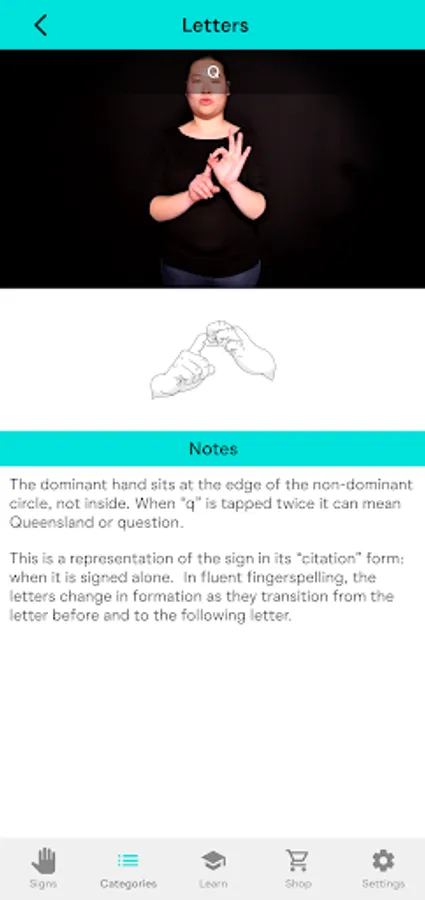 Easily find the sign you're looking for by searching our library with an English keyword, the sign handshape, or location. All signs link to a range of helpful information on location, shape, usage, and grammar, to help you learn the language. This information is displayed on screen along with a handy video guide.