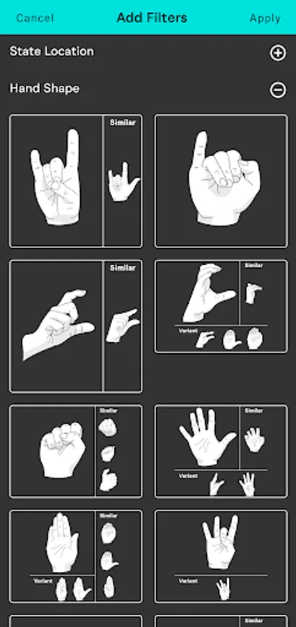 - an improved search mechanism that allows you to search signs by handshape, body location, and state location