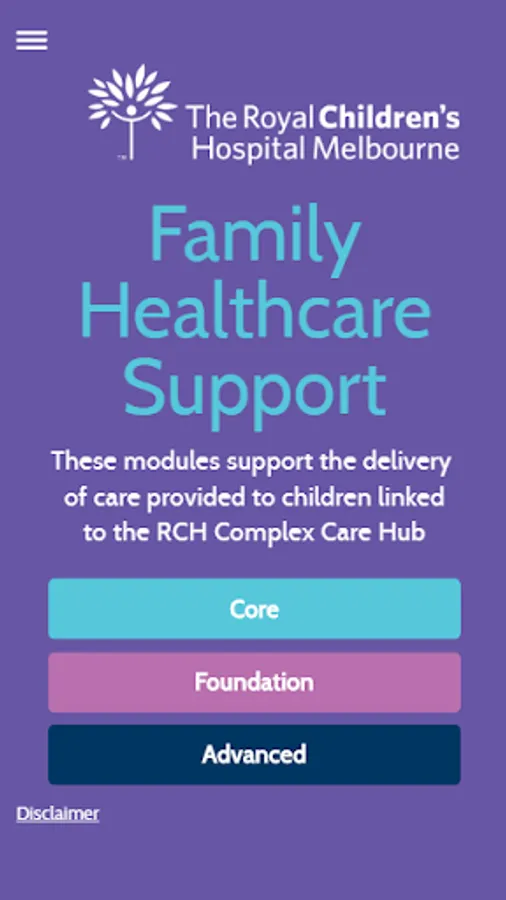 Family Healthcare support is community based care of children with complex needs. The app is designed to align with other RCH apps and is publicly accessible.