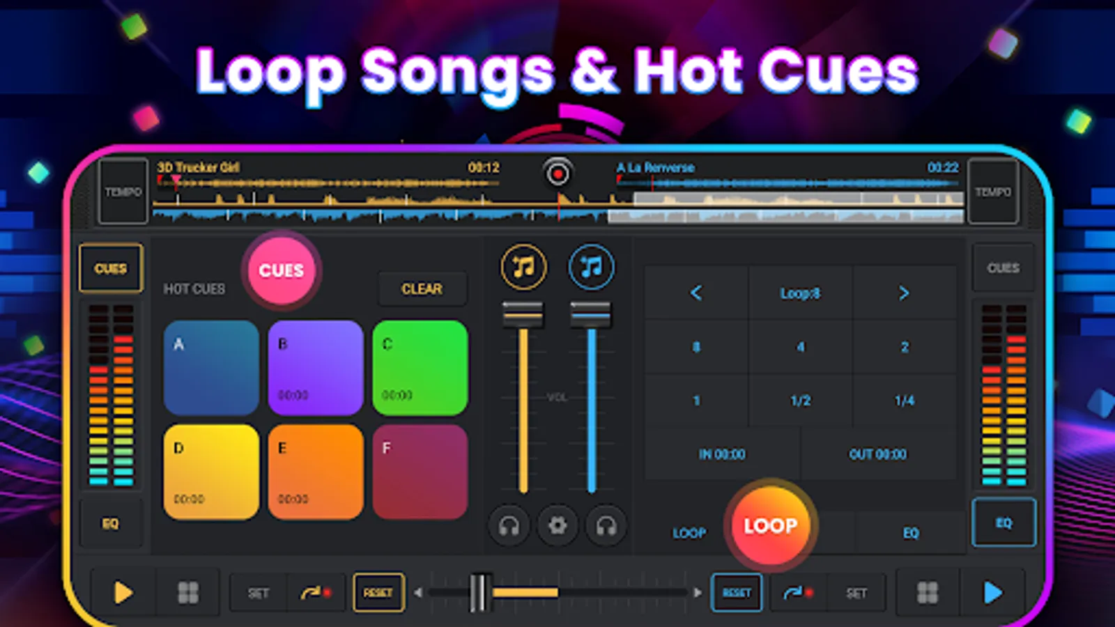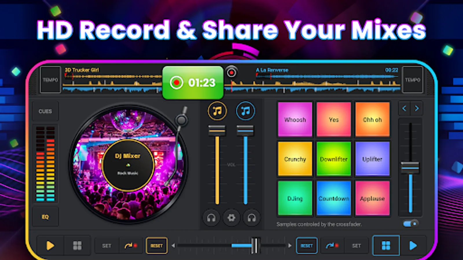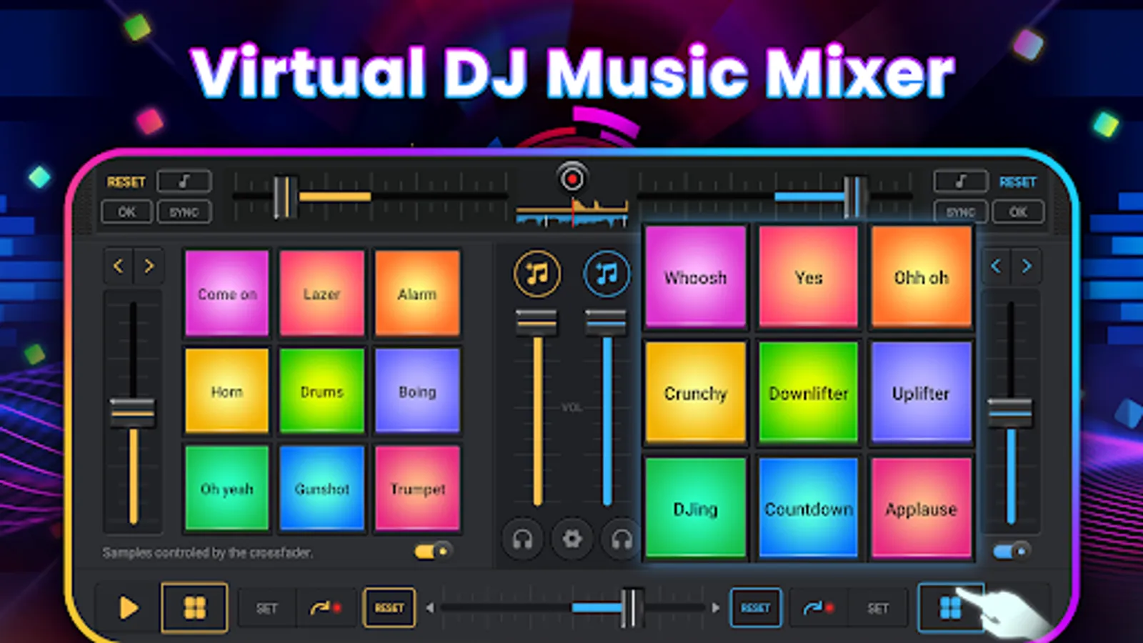 * Large buttons, optimized for small screens, simulate the realistic DJ console