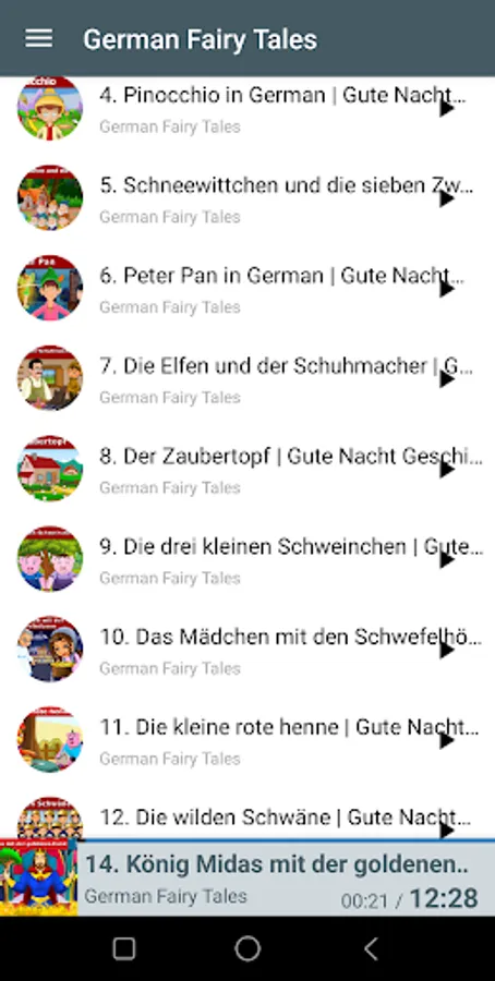 Listening The best and most popular fairy tales in German language, covering many topics: Magical stories, King and Queen, Princess stories, Animal, Witch, Giant Stories
