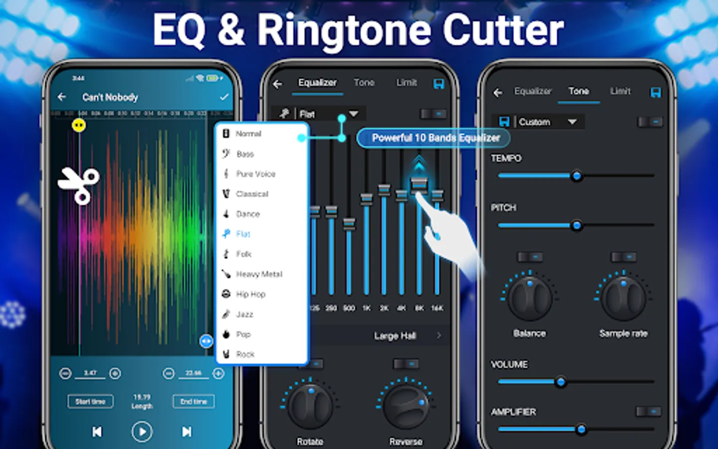 - Preset your music style (Normal, electronic, Classic, Dance, Flat, Folk, Heavy Metal, Hip hop, Jazz, Pop, Rock...)