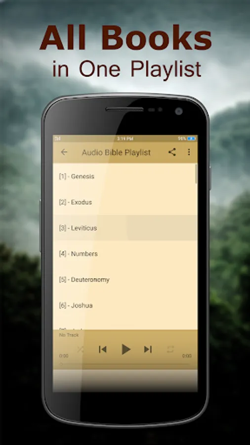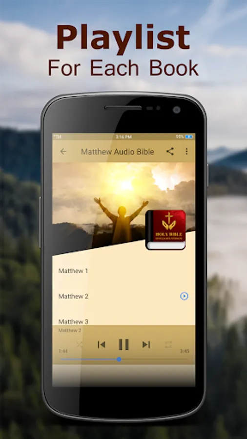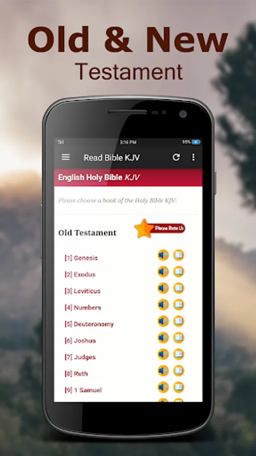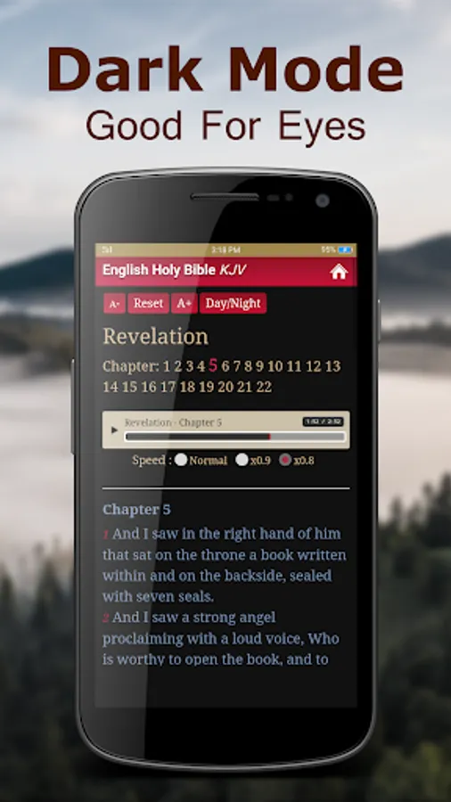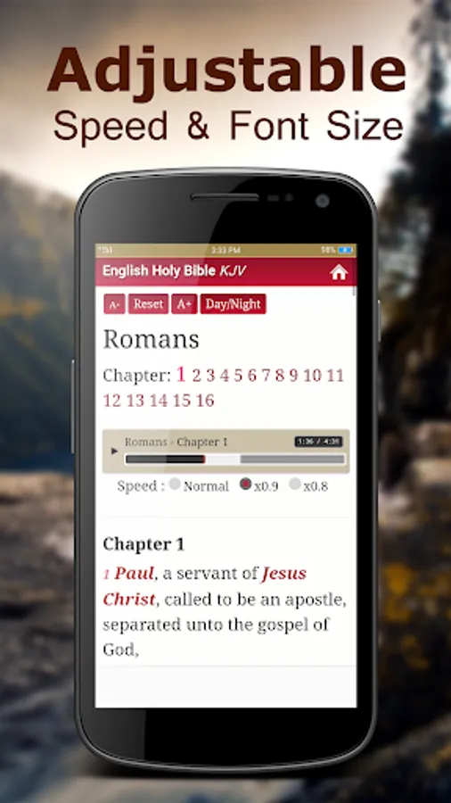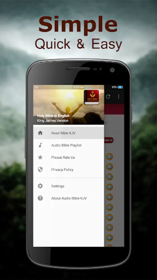 A simple, yet a powerful user interface is designed for easy navigation. Very easy access to all Chapters of Holy Bible King James Version. You can share the Bible verse you like with friends and family via text message, social network or email. With Background player function, you don't need to open the app screen all the time to listen to your favorite bibles.