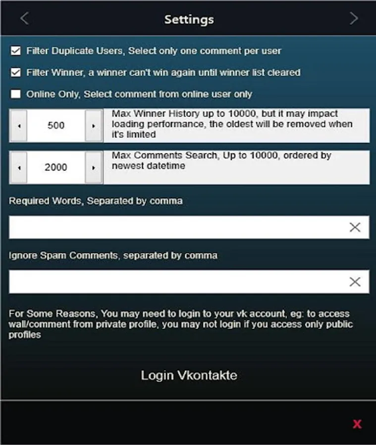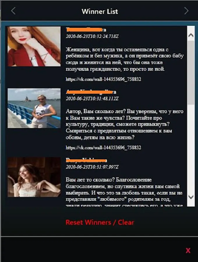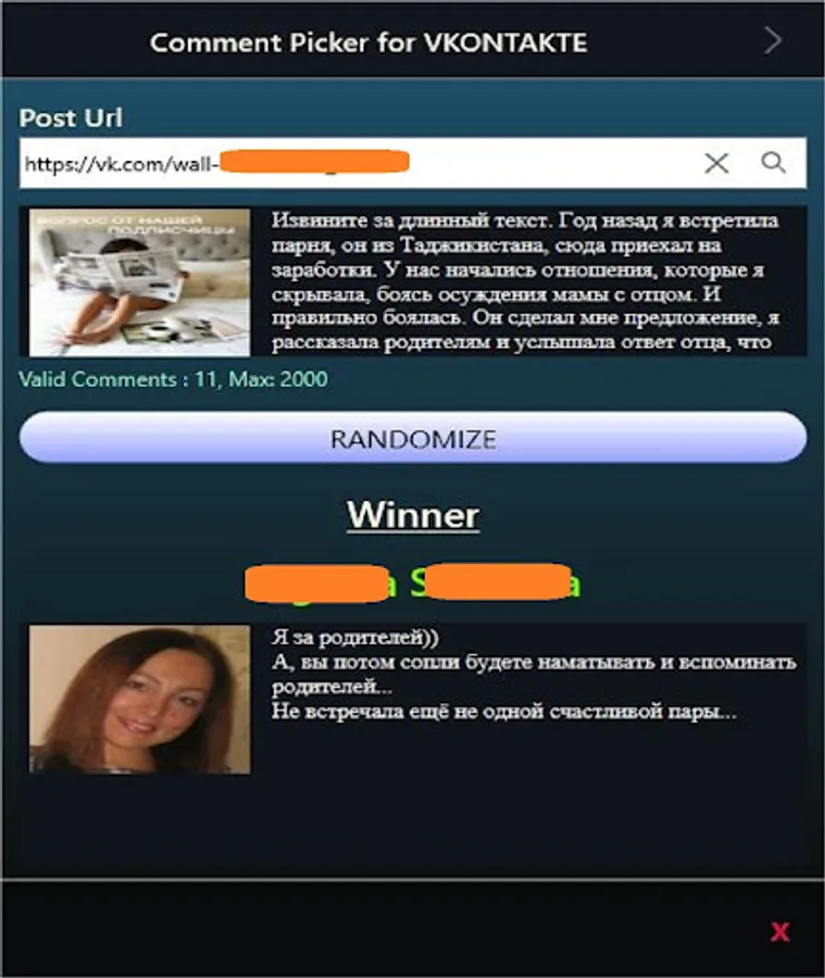 AwvPicker - Random Comment Picker is a simple, free tool to easily generate a winner for a vKontakte lottery, giveaway or promotion. By entering the URL of your vkontakte post, we can retrieve all comments and filter out duplicate names. You can only select comment from online users and ignore comments from offline users. You can pick a random winner out of all the comments by pressing the search button.