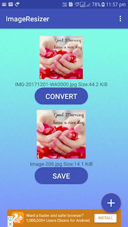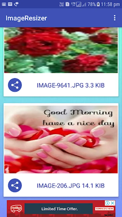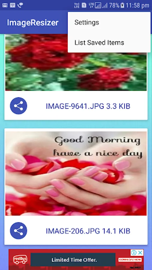 Convert Image size, reduce image size, share reduce size images from saved folder and list of converted images list.