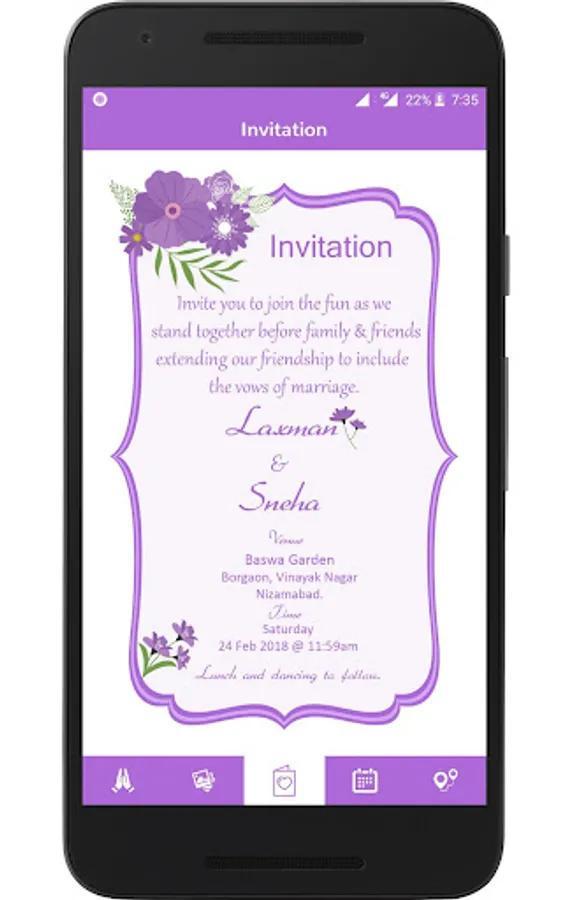 A completely customised and personalised wedding invite app with multi-lingual support, photo gallery of bride & groom, reminder and maps to ensure a hassle free and a comfortable journey for the guest.