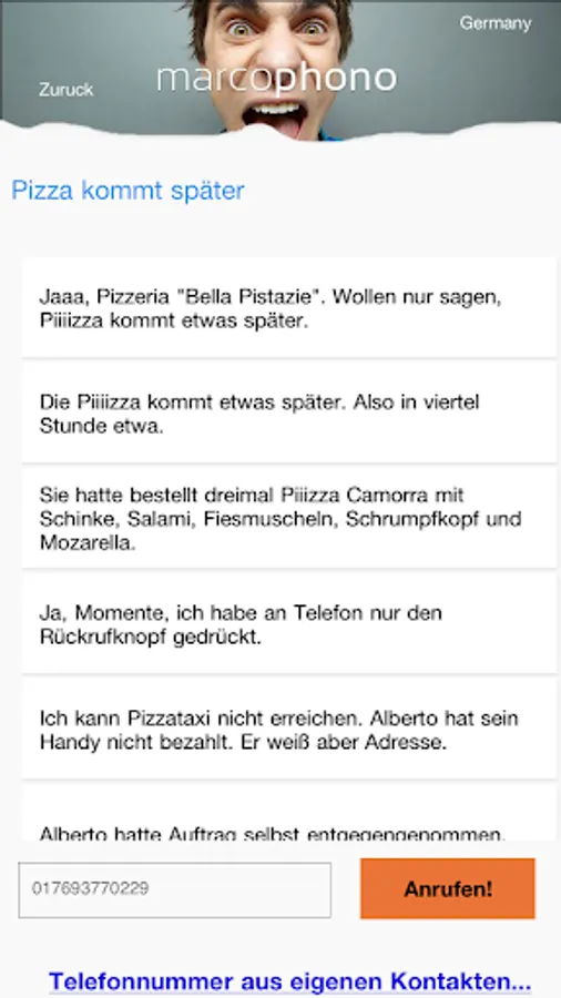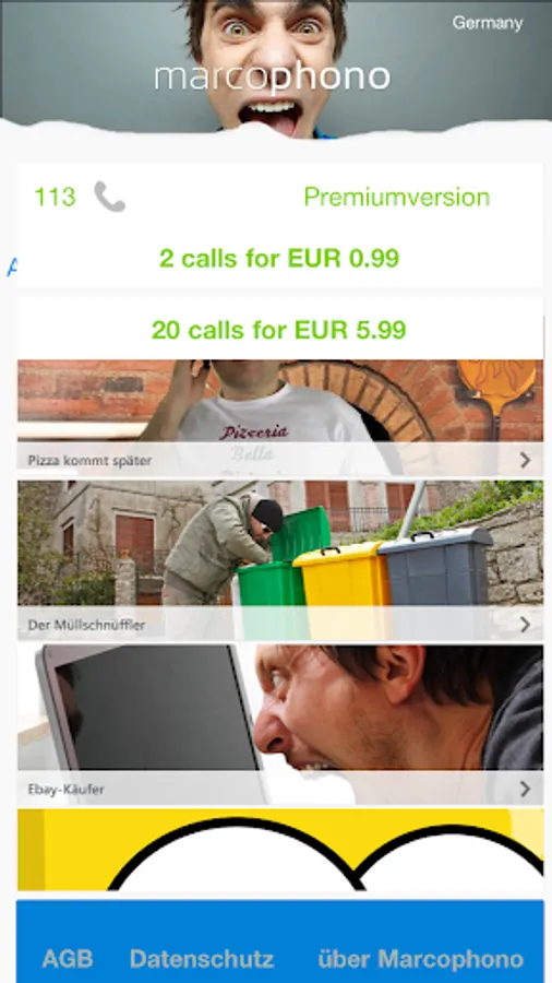 Call friends and acquaintances and play them ready-made audio modules. Simply by clicking on the appropriate buttons. Whether the crazy pizza baker announces his delivery or two drunks announce their visit: It's always great fun! And of course the person called does not find out who is behind the call, since the call is not actually made from your device, but via the Internet. Nevertheless, you can of course hear the called party in real time!