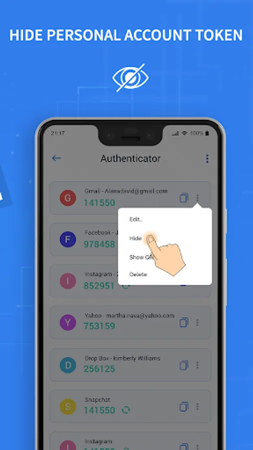Authenticator app generates Two Factor Authentication (2FA) codes for your online accounts. TOTP, HOTP and Mobile OTP are supported. The generated codes are one time tokens that provide an extra layer of security to your online accounts. After scanning a simple QR code, your account is protected. Using 2FA Authenticator helps keep your online accounts secure on supporting TOTP websites.