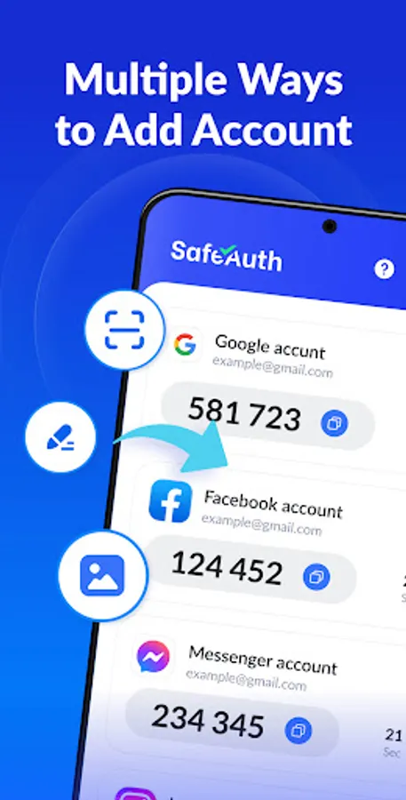 SafeAuth secures all your online accounts on your device by 2-step verification. It generates a unique time-based one-time password (TOTP) for each login, ensuring that only authorized users can access your account.