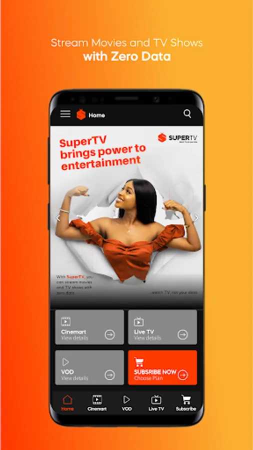 SuperTV is a unique subscription-based app that allows users to stream high-quality VOD content - movies, TV series, News, sports, and Live TV, plus other entertainment offerings without an active internet or data subscription (ZERO DATA).