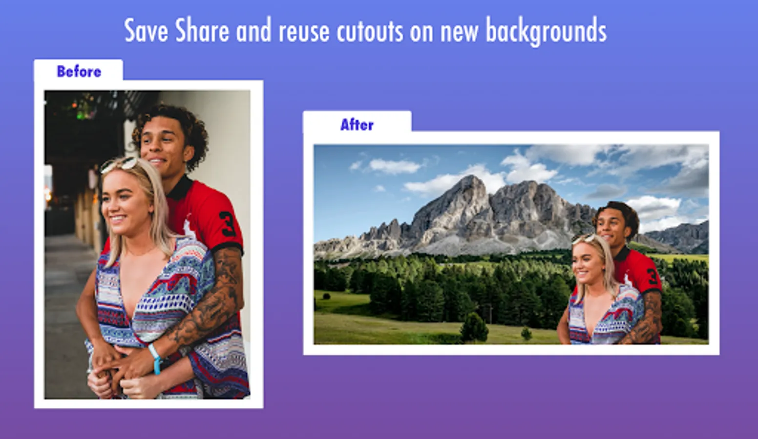 Select photo from your gallery - > Crop - > AI will auto detect people and do the magic -> save as transparent or apply new backgrounds