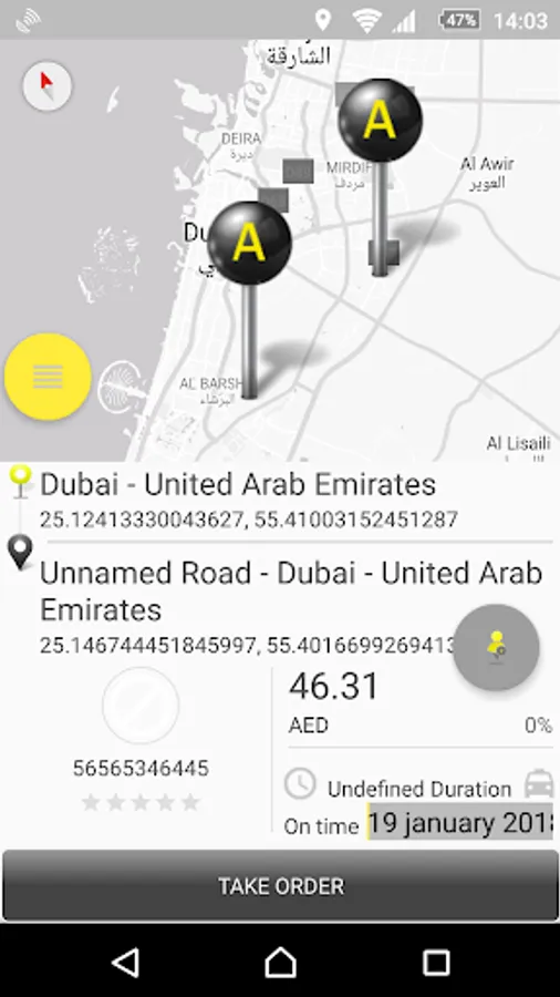 - Driver mode UI forms (A pins is an active Customer's Orders), Inquiry UI form on active Customer's Order in Driver Location Area opened (for Take Order).