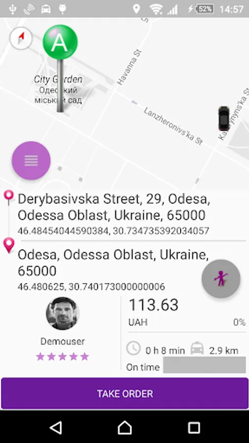 - Driver mode UI forms (A pins is an active Customer's Orders), Inquiry UI form on active Customer's Order in Driver Location Area opened (for Take Order).