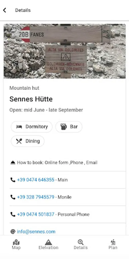 - Information about the Mountain Huts (Rifugi): phone number, email, price and beds