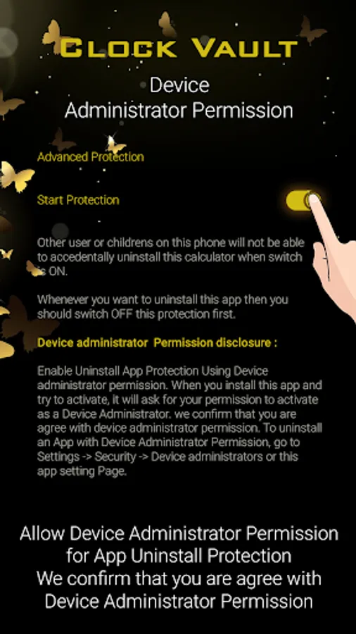 Clock Vault photo locker and video locker needs Device Administrator Permission to prevent it from being uninstalled by intruders and this app never use this permission except for uninstall prevention. Enable this permission from Settings.