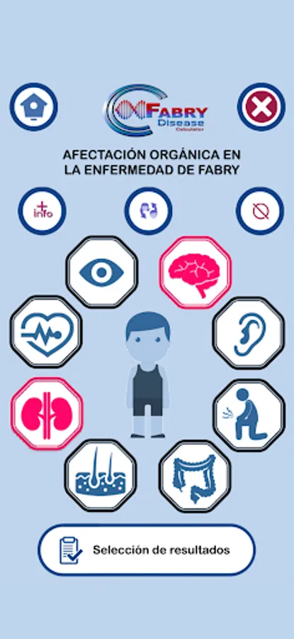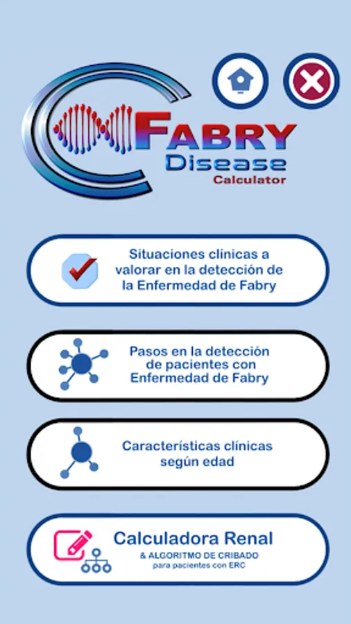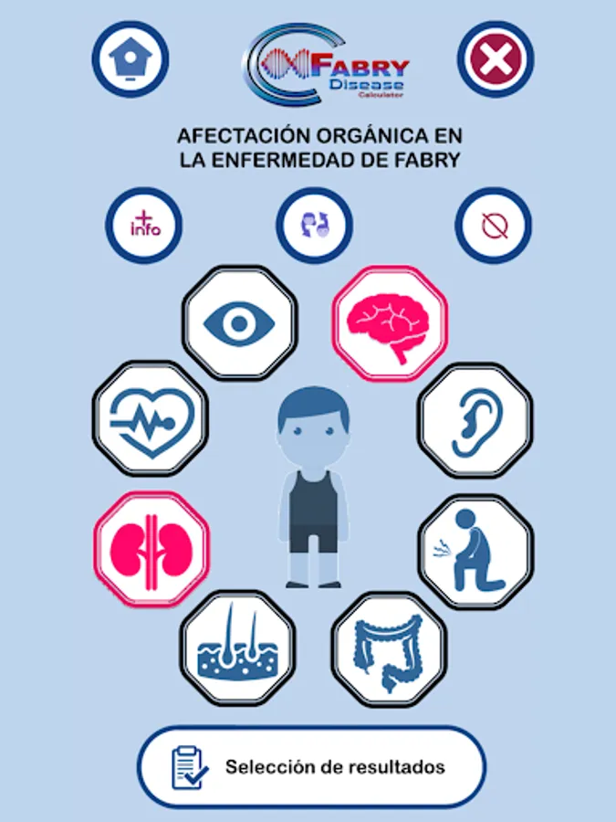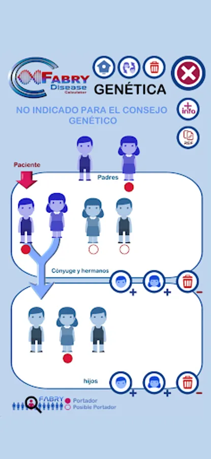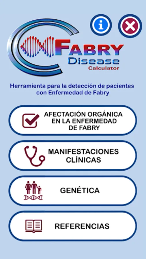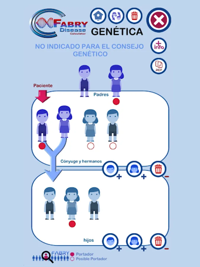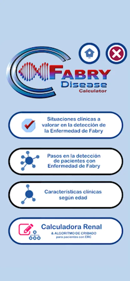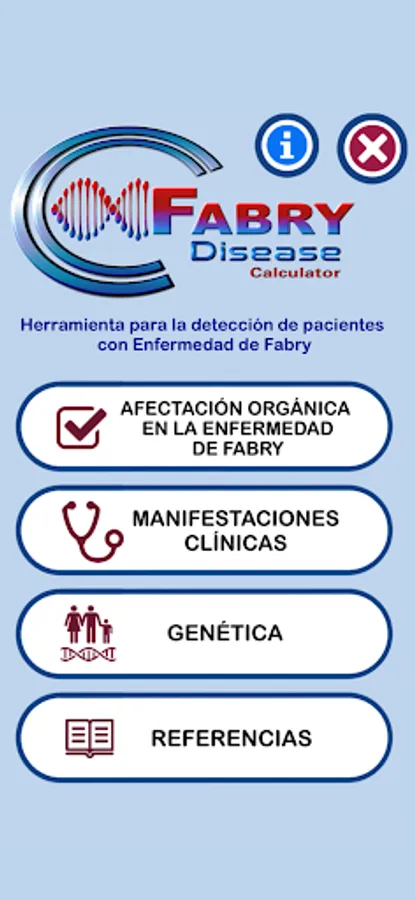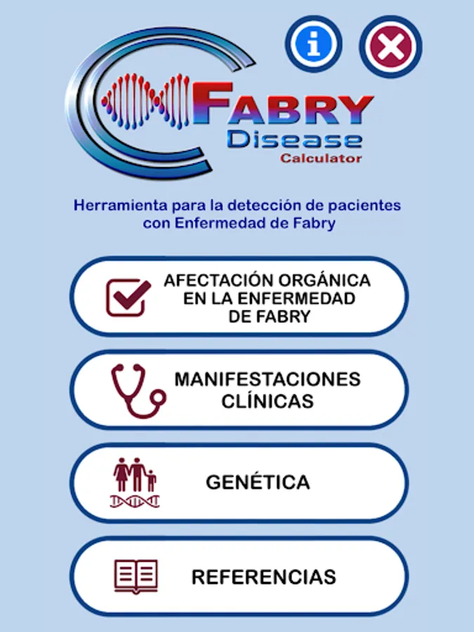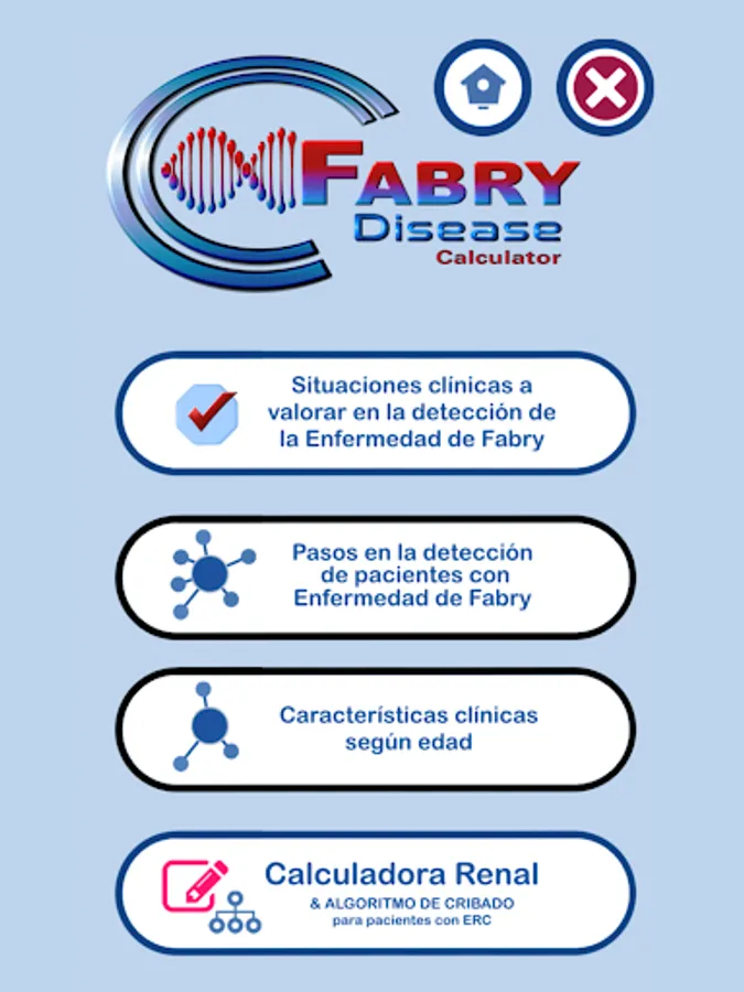 Application intended to aid in the detection of patients with Fabry Disease by providing clinical information through text, images and algorithms, calculation of renal function, graphic representation of the genetic tree of an index patient (not indicated for genetic counseling) and web links of the main guides and publications of interest of this disease.