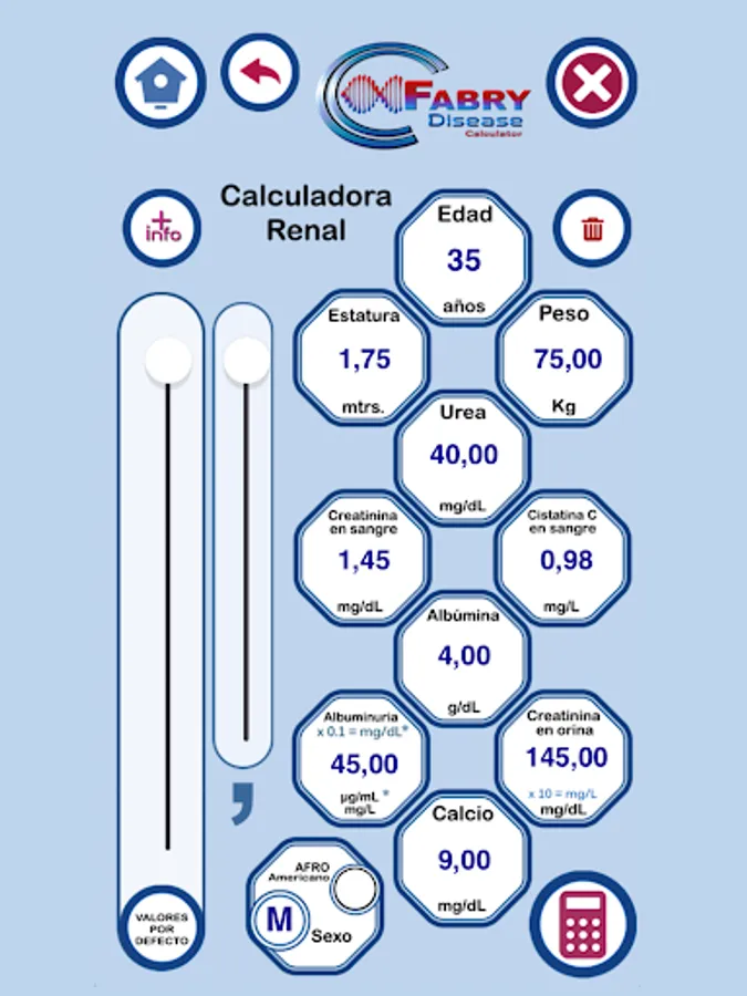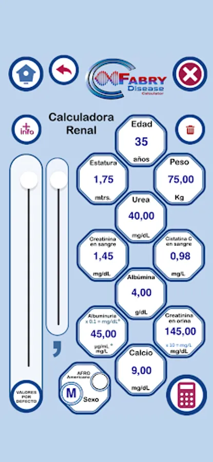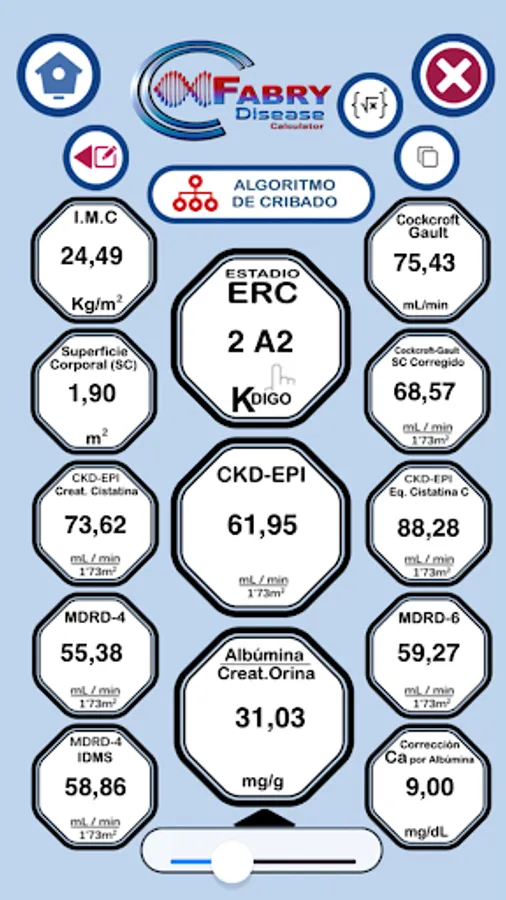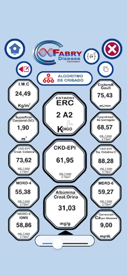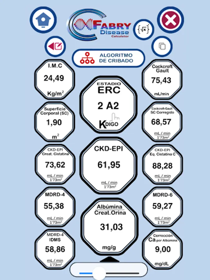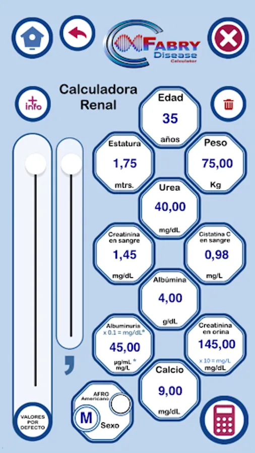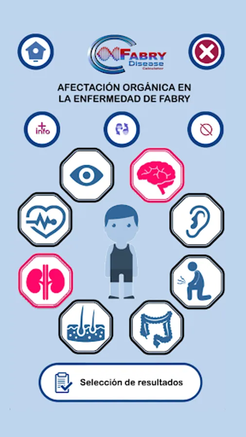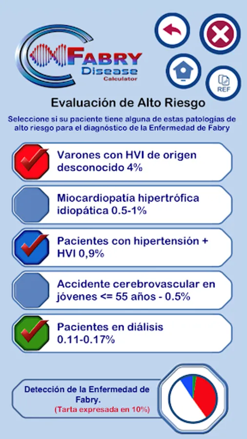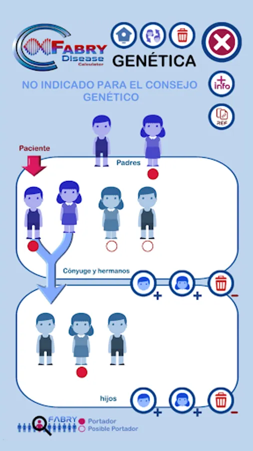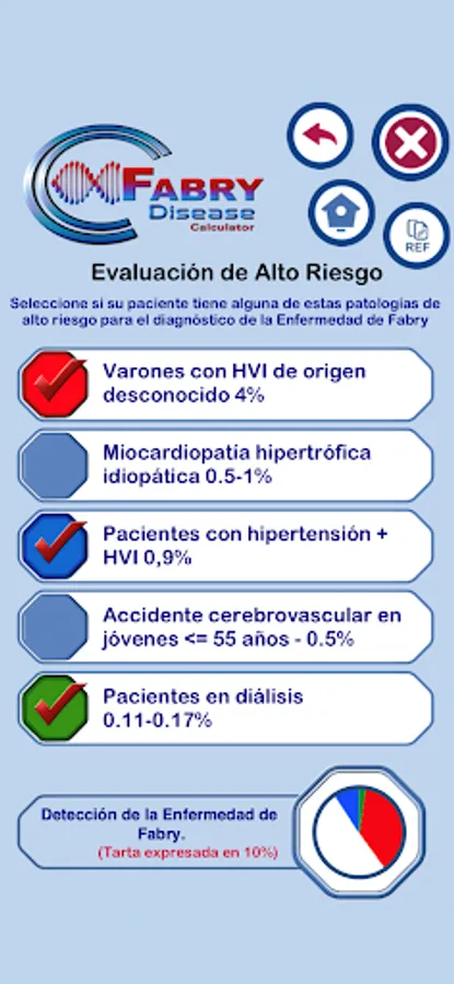 Application intended to aid in the detection of patients with Fabry Disease by providing clinical information through text, images and algorithms, calculation of renal function, graphic representation of the genetic tree of an index patient (not indicated for genetic counseling) and web links of the main guides and publications of interest of this disease.