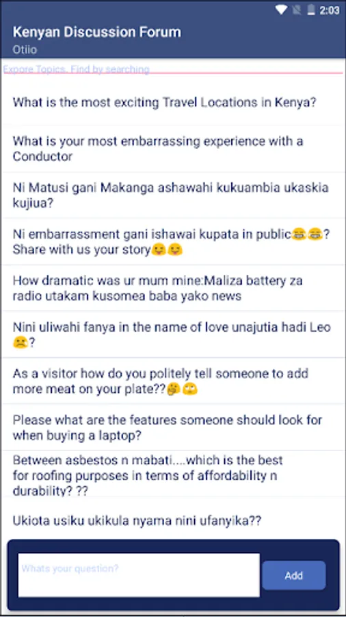 Kenyan Discussions App is a simple app where users can ask questions and get answers about Kenya. Have fun with the exciting Kenyan experiences
