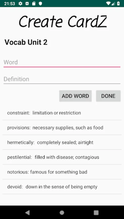 Using FlashcardZ, you can create a deck of flashcards for the any subject you desire. Simply add each word and its description one by one and save it. Once you have saved flashcards, you can study them and also take a quiz to test your knowledge!