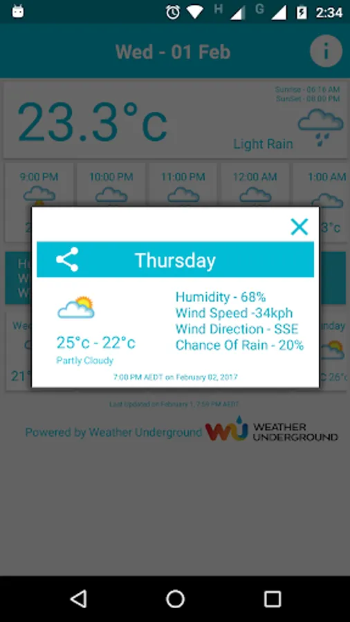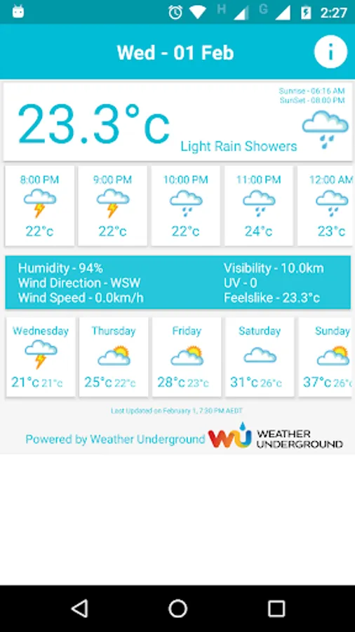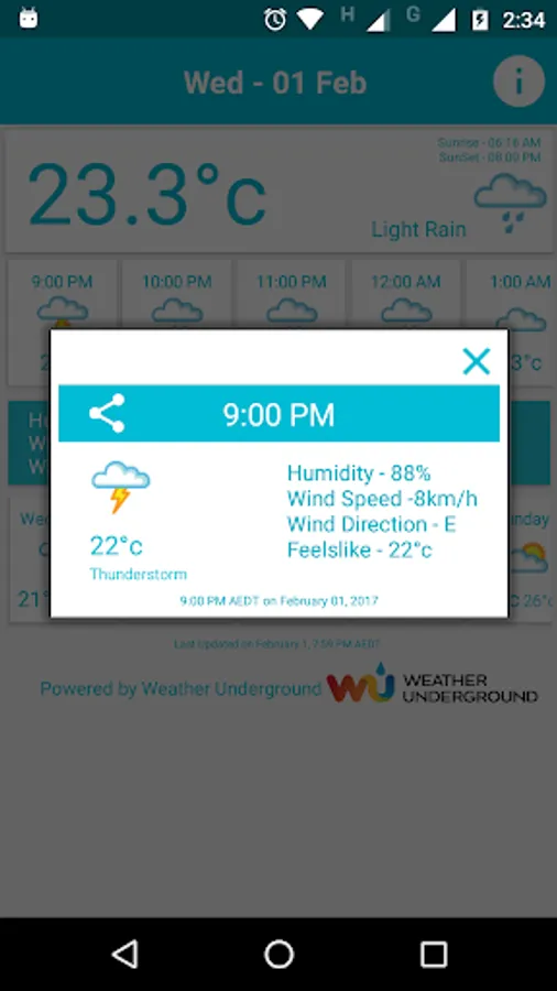 - Shows all weather conditions: humidity, wind direction, wind speed, feels-like, UV index, visibility, chance of rain and sunrise/sunset.
