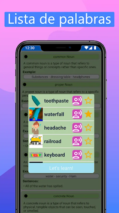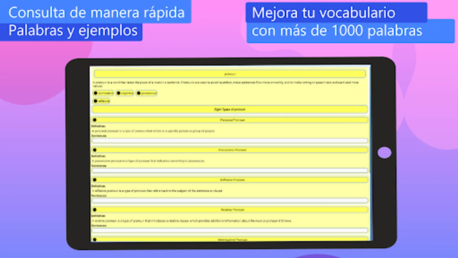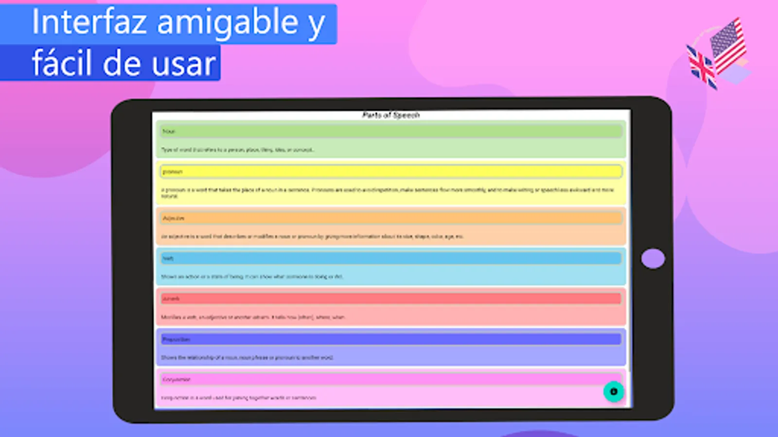 "Learn Parts of Speech" es una aplicación de aprendizaje del idioma inglés que está diseñada para ayudar a los usuarios a mejorar su comprensión de las partes de la oración, como verbos, adjetivos y sustantivos. Esta aplicación incluye una variedad de herramientas y recursos educativos, como juegos, pronunciación y ejemplos de oraciones, que están diseñados para hacer que el aprendizaje sea más fácil y atractivo.
