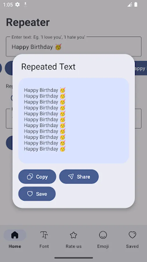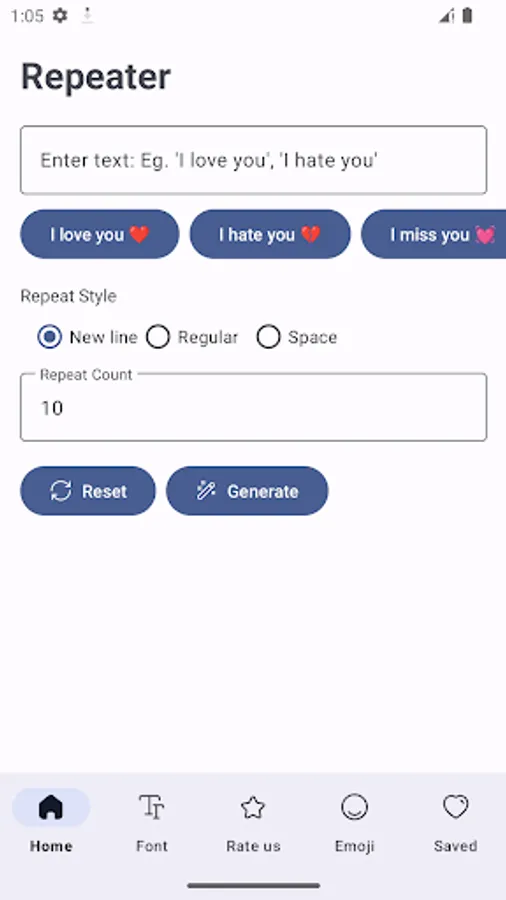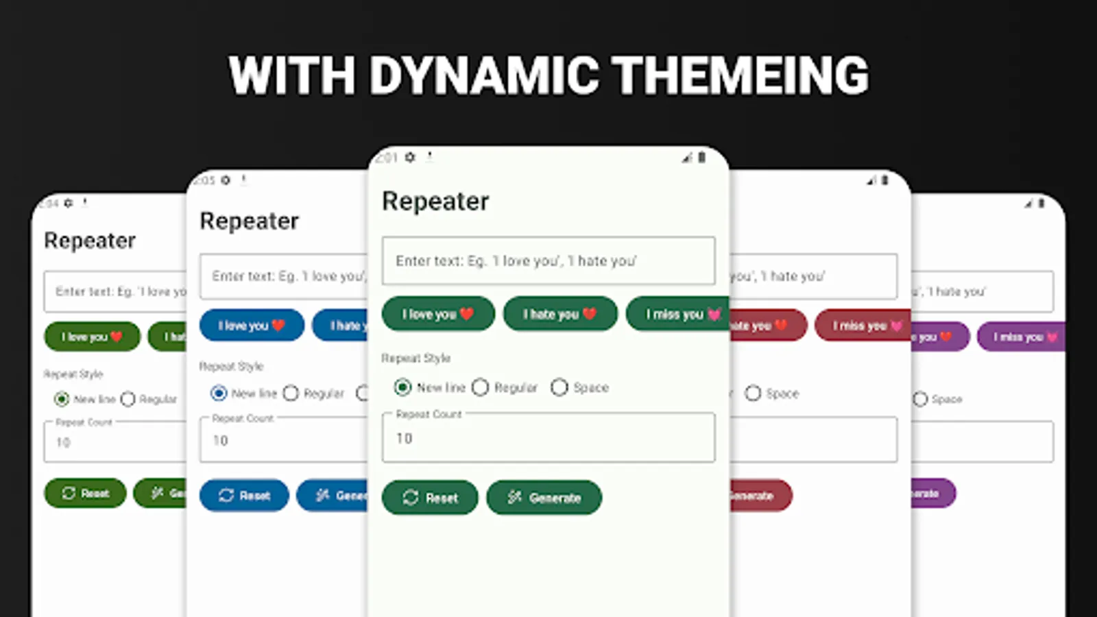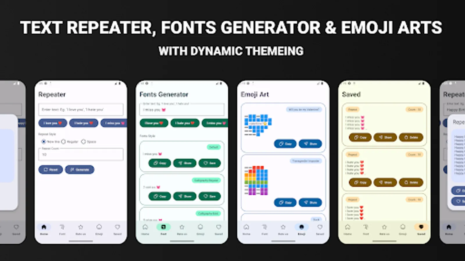 Enjoy a seamless app experience as you save the generated repeating text and font styles. "Text Repeater - Fonts & Emoji" is designed with a material design interface, providing a modern and intuitive user experience. The app dynamically adjusts its colors based on the color palette of your personal device, ensuring a visually pleasing and personalized interface.