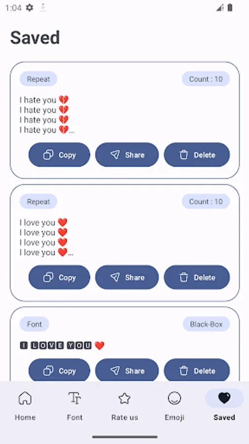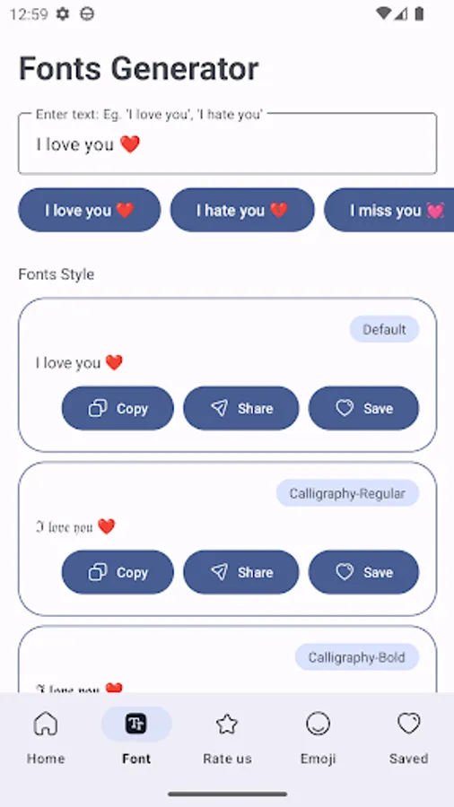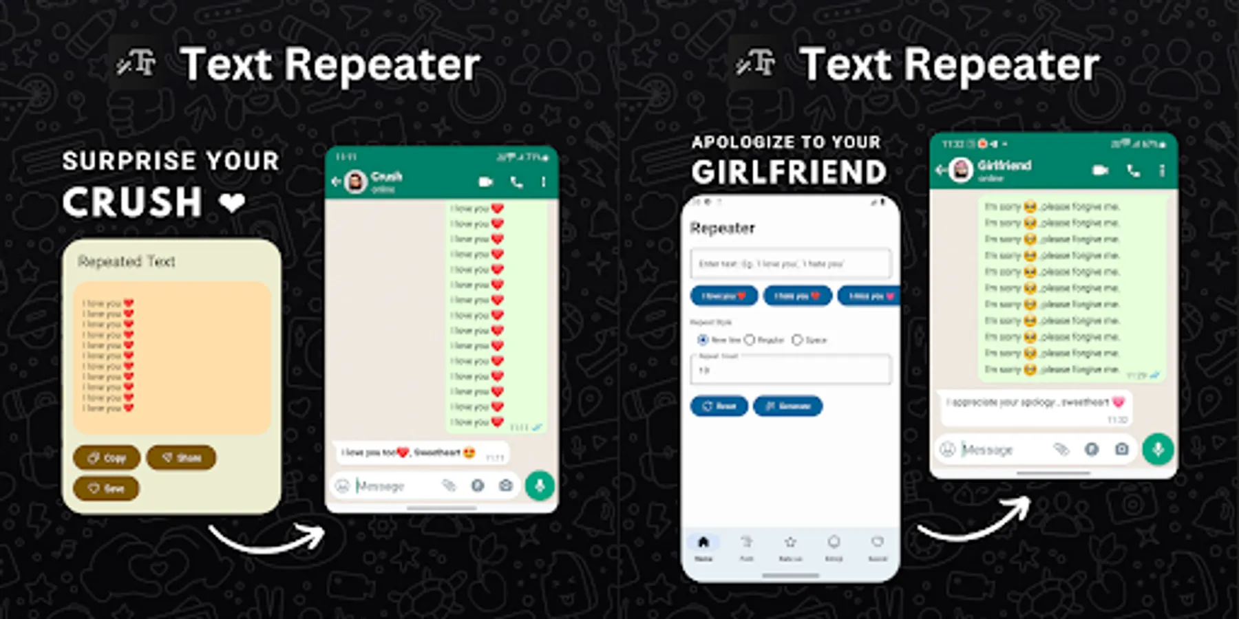 Introducing "Text Repeater - Fonts & Emoji" – the ultimate all-in-one app for generating repeating text, stylish fonts, and captivating emoji arts. Surprise your loved ones by creating repeated text phrases like "I love you ❤️" or "I miss you ❤️" with just a few taps. It's easy to use and offers convenient options such as Copy, Share, Direct Share to Social Media Apps, making it incredibly versatile.