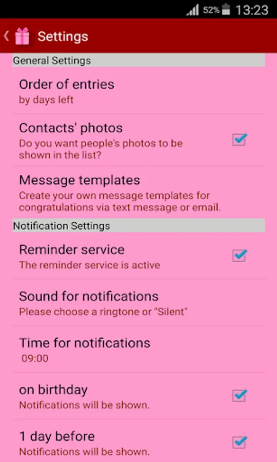 - Days of notification; On the day, 1 day ago 2 days ago 1 week ago, 15 days ago.