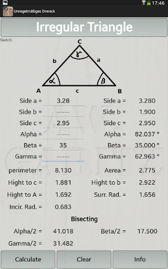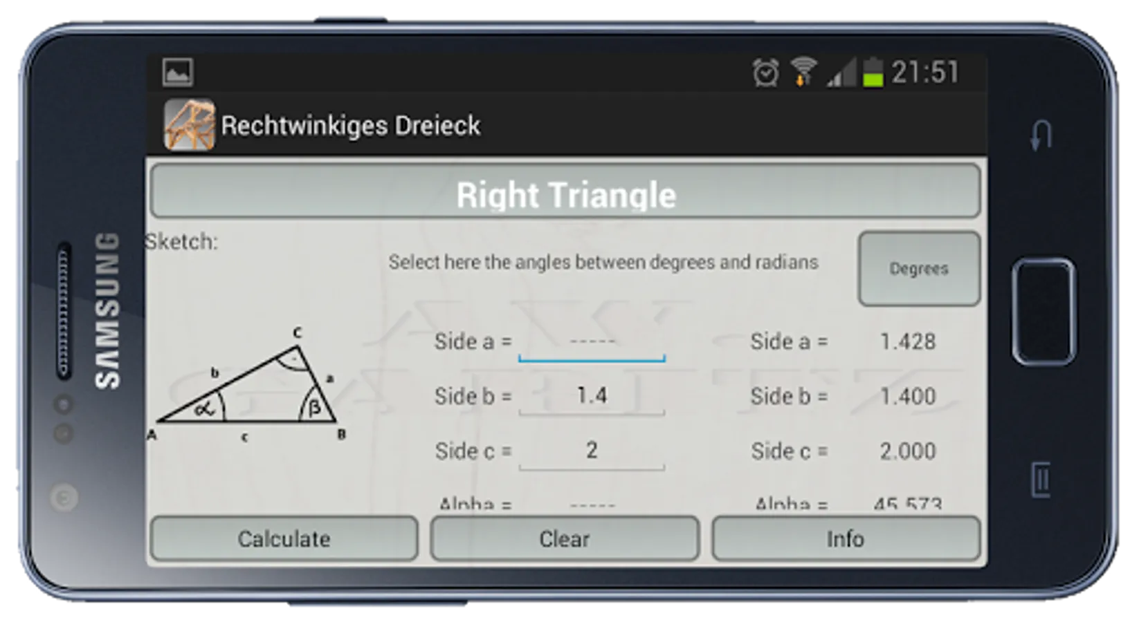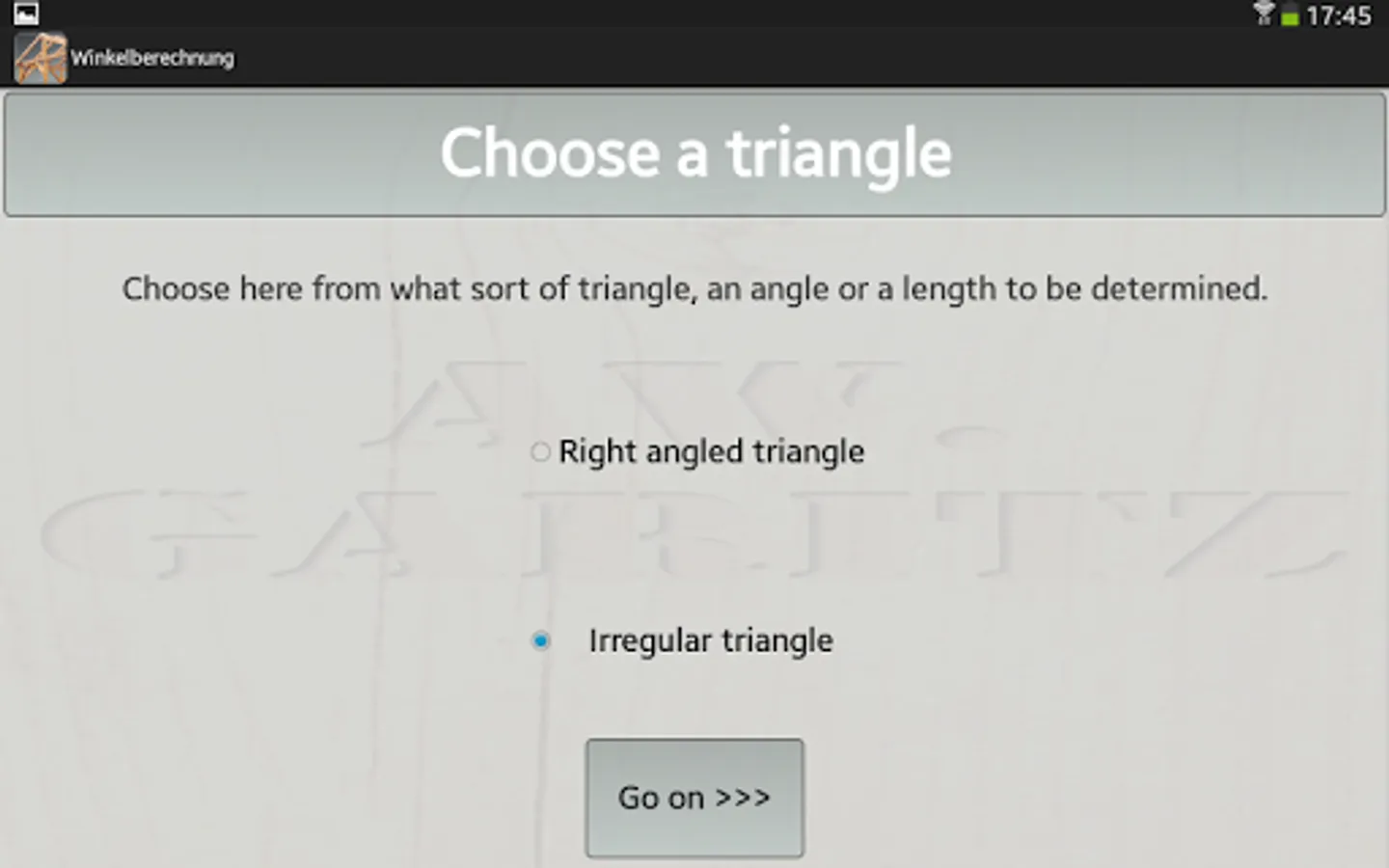 Here you can select between a rectangular and an irregular triangle. Enter their existing dimensions. The app calculates all necessary measures, such as missing sides and angles, area, perimeter and radius of innercircle and outercircle. The third point, a right angle using the 3-4-5 method (Pythagoras) is determined. Here you need to know only one side of the triangle. In the fourth point, you can measure the angle using the camera and the G-sensor.