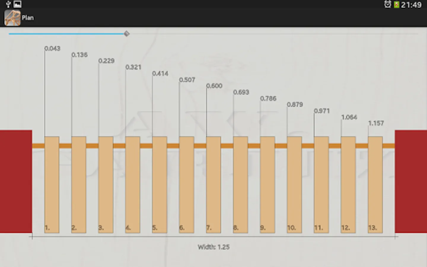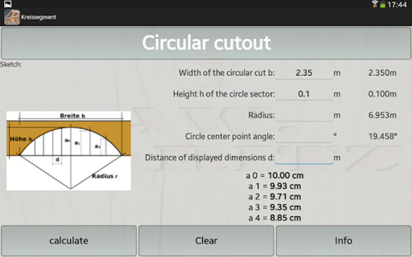 Enter two of the required dimensions and the app calculates, for example, Cutting height, central angle, width and radius. Enter the width of the desired distances from the center and draw it upwards. You only have to draw the calculated values from the center to the outside of the respective measure and there is a circular line after which you can cut your workpiece.
