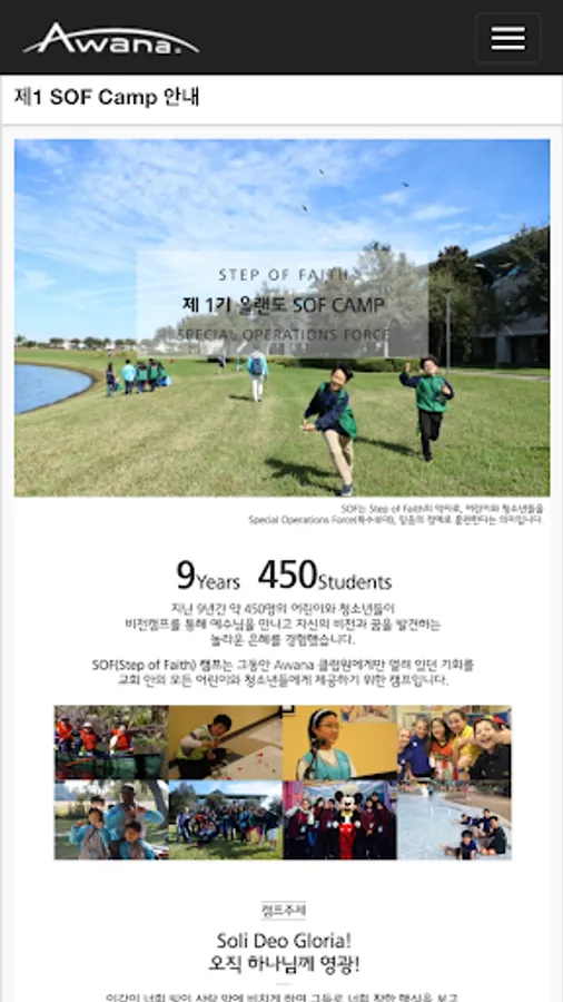 Nagamyeo raise a generation of a "stiff that recognized workers without" faith give a challenge to the students of Christian of Christian students and South Korea in the West, and the Christian students in Asia a strong faith in each other through Awana Clubs receive verbal and missionary Networking It will continue to strengthen. South Korea Awana is the way of the gospel of Awana seniors in the world they walked, going to continue to walk boldly and not be ashamed.