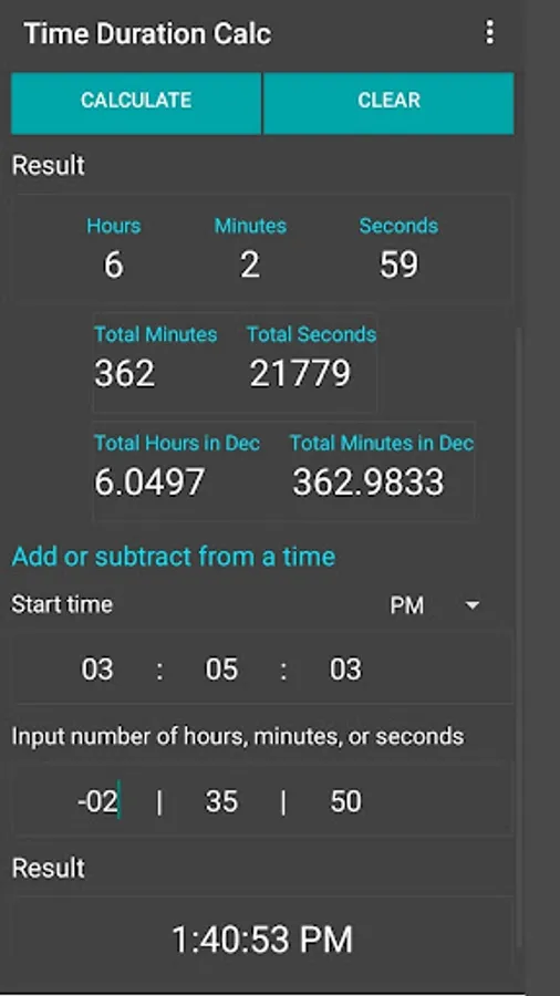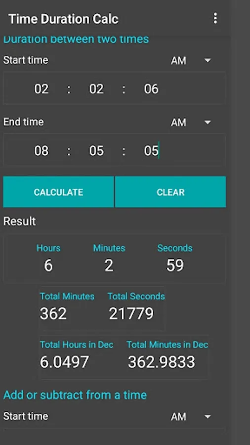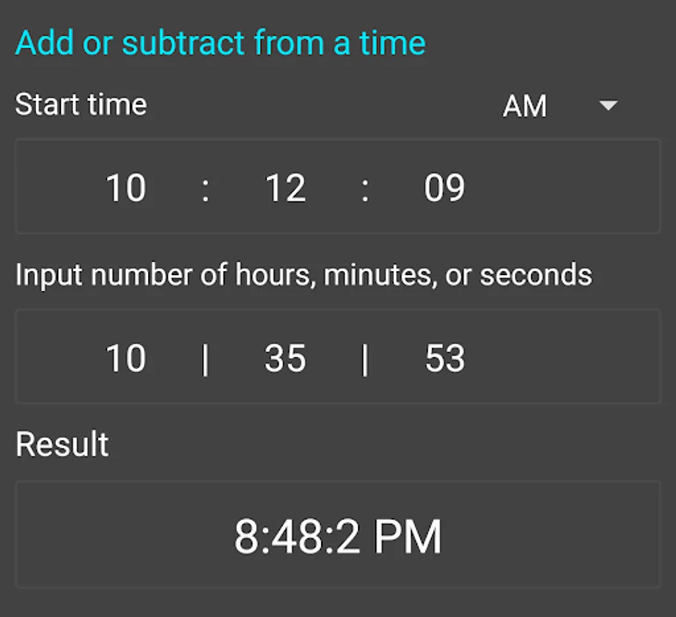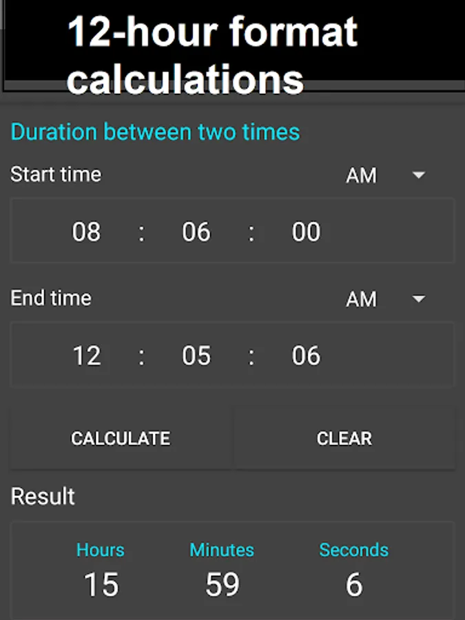 Time Calculator Pro is simple to calculate time duration between times and datetimes. You also can use it to subtract hours, minutes or seconds from a starting time, add or subtract two time values.