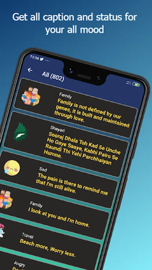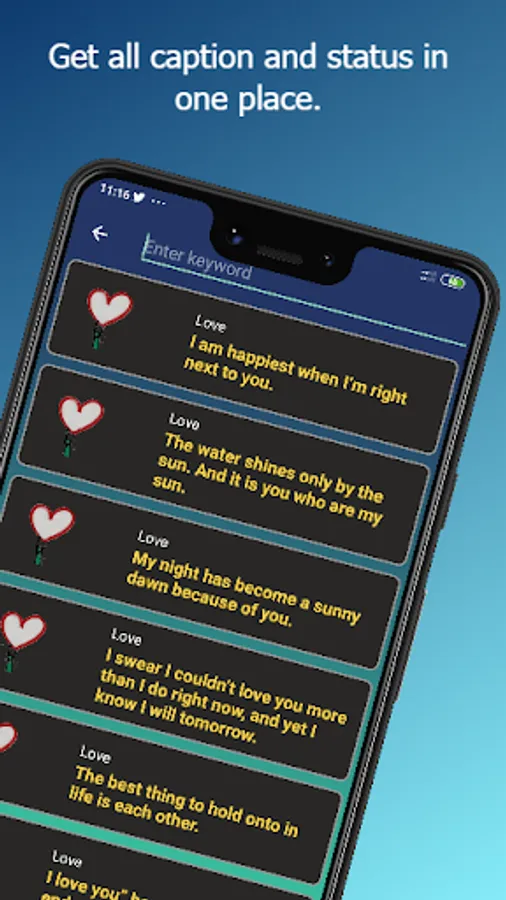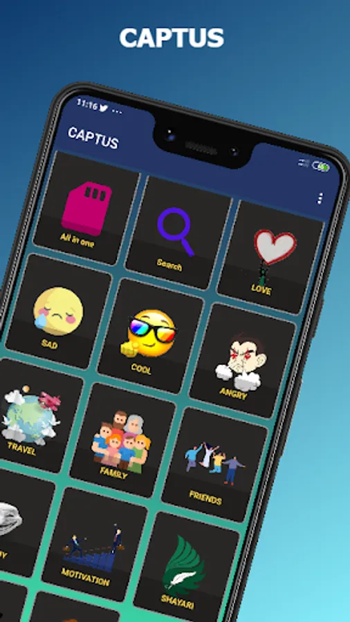 In CAPTUS you will more than 700 different type of caption and status with more than 10 different categories. Above all you can search the status also. and you will get all the items in one place also. Hope you will like my application. And please let us know about your feedback.